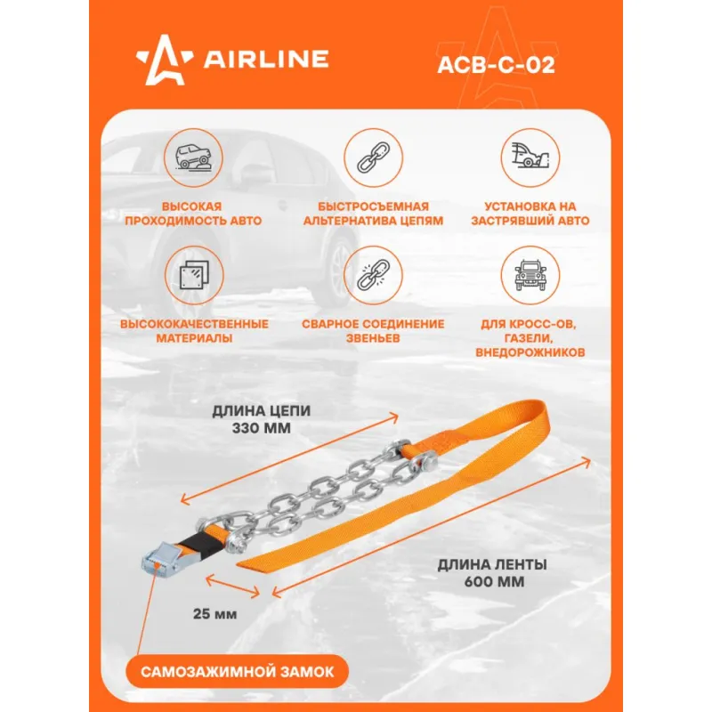 Цепи (браслеты) противоскольжения для кросс-ов (колёса 205-225 мм), к-т 4 шт. Описание: Браслеты противоскольжения на колеса - надежное приспособление, которое обеспечит безопасность вождения вашего автомобиля offroad, во время выездов на природу, на охоту или рыбалку, поездок в деревню и на дачу. Благодаря браслетам противоскольжения, Вы сможете проехать по легкому бездорожью, преодолеть скользкий подъем, глубокий снег или выбраться из колеи! Не имеет значения, какой привод на вашей машине: передний, задний или полный. Браслеты надежно крепятся к колесам и дискам шин при помощи замка и ваше авто справится с любыми дорожными условиями. Специальное антипробуксовочное покрытие и усиленная железная конструкция обеспечивают надежное сцепление с дорогой и предотвращают пробуксовку. Браслеты противоскольжения выполнены из оцинкованной стали и металла, что делает их прочными и устойчивыми к износу. Толщина звена обеспечивает достаточную прочность и стабильность на дороге. Характеристики: Артикул: ACB-C-02 Вид замка: пружинный, самозажимной Материал замка: силумин Длина ленты, мм: 600 Ширина ленты, мм: 25 Длина цепи, мм: 330 Толщина звена, мм: 5 Покрытие стали: оцинкованная Длина звена, мм: 36 Соединение цепи: сварное Ширина шины, мм: 205-225 Комплектация: Браслеты - 4 шт Крючок для монтажа - 1 шт Инструкция - 1 шт Мешок (ткань) с ручкой - 1 шт Гарантия: от 1 года.