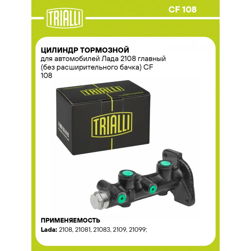 Цилиндр тормозной для автомобилей Лада 2108 главный (без расширительного бачка) Характеристики: Артикул: CF 108 OEM номера: 2108-3505010, 2108-0350501-000, 2108-3505010М Особенности конструкции:: Без расширительного бачка Сопутствующий товар: Вакуумные усилители тормозов: VA 558 Количество на автомобиль: 1 Диаметр, мм: 20.6 Количество присоединений: 4 Размер резьбы 1: 4xM10x1.25 Гарантийный срок: 2 года / 60 000 км Длина 1, мм: 193.5 Длина 2, мм: 152 Товарная линейка: BLACK Подходит для авто: ВАЗ 2108, 2108, 21081, 21083, 2109, 2109, 21099, 21099, 21099, 21093, 2110, 2110, 2111, 2111, 2112, 2112, 2113, 2114, 2115, 2108, 2108, 2109, 2109, 21099, 21099, 2110, 2111, 2112, 2113, 2114, 2115 Для проверки применяемости отправьте VIN автомобиля через вкладку "Есть вопросы о товаре?" Комплектация: Цилиндр главный тормозной - 1 шт Гарантия: от 1 года.