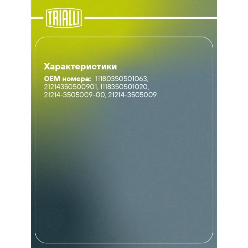 Цилиндр тормозной для автомобилей Лада 1118 / 2170 / 2190 / 21214 с ABS главный (без расширительного бачка) Характеристики: Артикул: CF 009 OEM номера: 11180350501063, 21214350500901, 1118350501020, 21214-3505009-00, 21214-3505009 Длина 2, мм: 87 Количество на автомобиль: 1 Диаметр, мм: 22.2 Особенности конструкции:: Для автомобилей с ABS, без расширительного бачка Количество присоединений: 2 Размер резьбы 1: М12x1 Гарантийный срок: 2 года / 60 000 км Размер резьбы 2: М10х1 Длина 1, мм: 161 Товарная линейка: BLACK Комплектация: Цилиндр главный тормозной - 1 шт Гарантия: от 1 года.