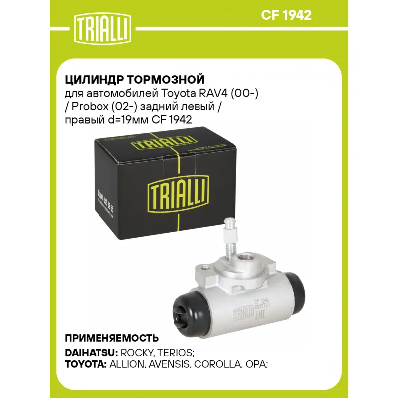 Цилиндр тормозной для автомобилей Toyota RAV4 (00-) / Probox (02-) задний левый / правый d=19мм Характеристики: Артикул: CF 1942 OEM номера: 4755042020, 47550B4010 Сопутствующие товары: Колодки тормозные барабанные: GF 1910, GF 4556 Количество на автомобиль: 2 Диаметр, мм: 19 Размер резьбы: M10x1 Гарантийный срок: 2 года / 60 000 км Материал: Алюминий Сторона установки: Задняя ось Товарная линейка: BLACK Комплектация: Цилиндр тормозной - 1 шт Гарантия: от 1 года.