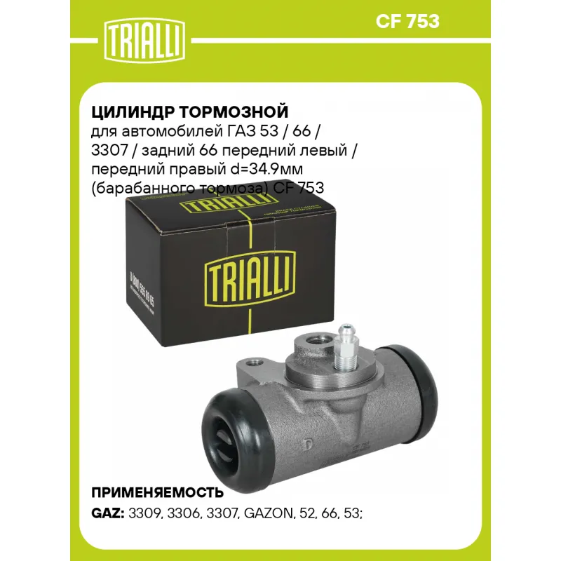 Цилиндр тормозной для автомобилей ГАЗ 53 / 66 / 3307 / задний 66 передний левый / передний правый d=34.9мм (барабанного тормоза) Характеристики: Артикул: CF 753 OEM номера: 4301-3501040 Материал: Чугун Размер резьбы: M12x1.25 Диаметр, мм: 34.9 Сторона установки: Передняя/задняя ось Количество на автомобиль: 2 Гарантийный срок: 2 года / 60 000 км Товарная линейка: BLACK Комплектация: Цилиндр тормозной - 1 шт Гарантия: от 1 года.