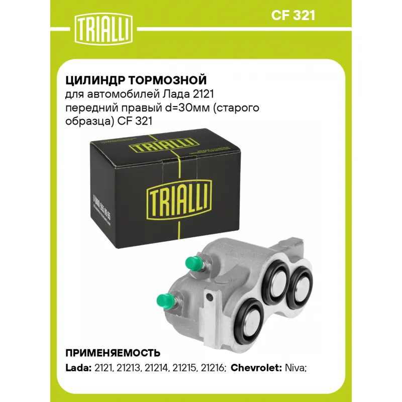 Цилиндр тормозной для автомобилей Лада 2121 передний правый d=30мм (старого образца) Характеристики: Артикул: CF 321 OEM номера: 2121-3501178, 2121-0350117-8, 2121-0350117-800, 21210-3501016-00 Диаметр, мм: 30 Парный товар: CF 221 Количество на автомобиль: 1 Особенности конструкции:: Старого образца, 3-х поршневой Сторона установки: Передняя ось справа Гарантийный срок: 2 года / 60 000 км Товарная линейка: BLACK Подходит для авто: ВАЗ 2121, 21213, 21214, 21215, 21216, 2123, 2120, 2121, 21213, 21213, 21214, 21214, 2123 Chevrolet Niva (02-) Для проверки применяемости отправьте VIN автомобиля через вкладку "Есть вопросы о товаре?" Комплектация: Цилиндр тормозной - 1 шт Гарантия: от 1 года.