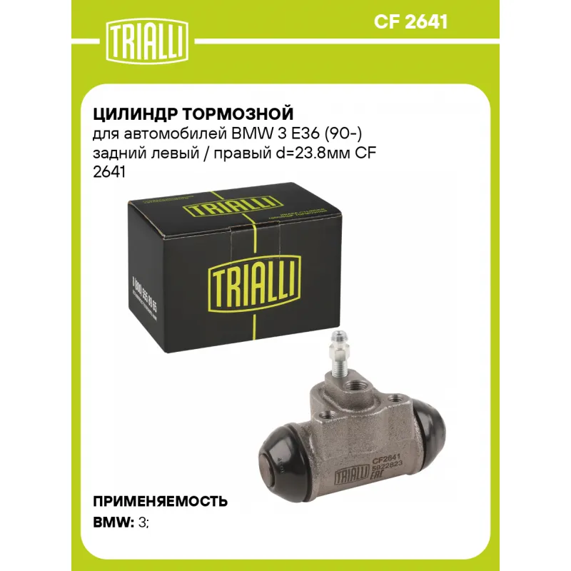 Цилиндр тормозной для автомобилей BMW 3 E36 (90-) задний левый / правый d=23.8мм Характеристики: Артикул: CF 2641 OEM номера: 1163856, 1159569, 1160502, 34211159569, 34211160502, 34211163856 Сопутствующие товары: Колодки тормозные барабанные: GF 2605 Количество на автомобиль: 2 Диаметр, мм: 23.8 Тормозная система: TRW Размер рез... Читать полностью →