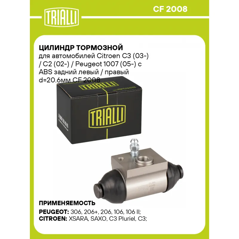 Цилиндр тормозной для автомобилей Citroen C3 (03-) / C2 (02-) / Peugeot 1007 (05-) с ABS задний левый / правый d=20.6мм Характеристики: Артикул: CF 2008 OEM номера: 4402000, 440200000, 4402C8, 4402E3 Сопутствующие товары: Колодки тормозные барабанные: GF 4576 Количество на автомобиль: 2 Диаметр, мм: 20.6 Особенности конструкции:: Автомобиль с ABS Тормозная система: TRW Размер резьбы: M10x1 Гарантийный срок: 2 года / 60 000 км Материал: Алюминий Сторона установки: Задняя ось Товарная линейка: BLACK Комплектация: Цилиндр тормозной - 1 шт Гарантия: от 1 года.