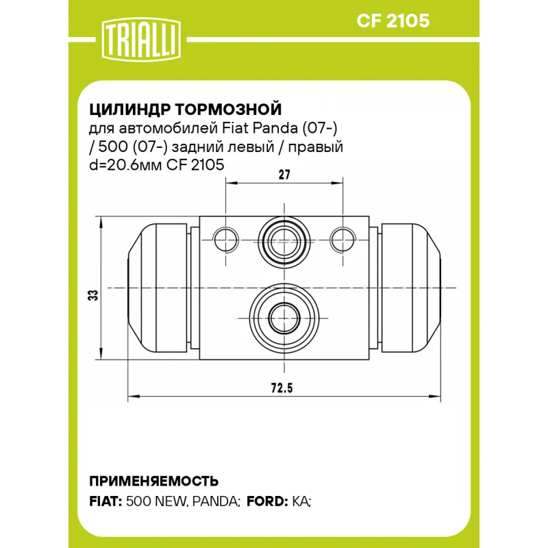 Цилиндр тормозной для автомобилей Fiat Panda (07-) / 500 (07-) задний левый / правый d=20.6мм Характеристики: Артикул: CF 2105 OEM номера: 77365803, 1713760, AS512261AA Сопутствующие товары: Колодки тормозные барабанные: GF 1070 Количество на автомобиль: 2 Диаметр, мм: 20.6 Тормозная система: APL Размер резьбы: M10x1 Гарантийный срок: 2 года / 60 000 км Материал: Алюминий Сторона установки: Задняя ось Товарная линейка: BLACK Комплектация: Цилиндр тормозной - 1 шт Гарантия: от 1 года.