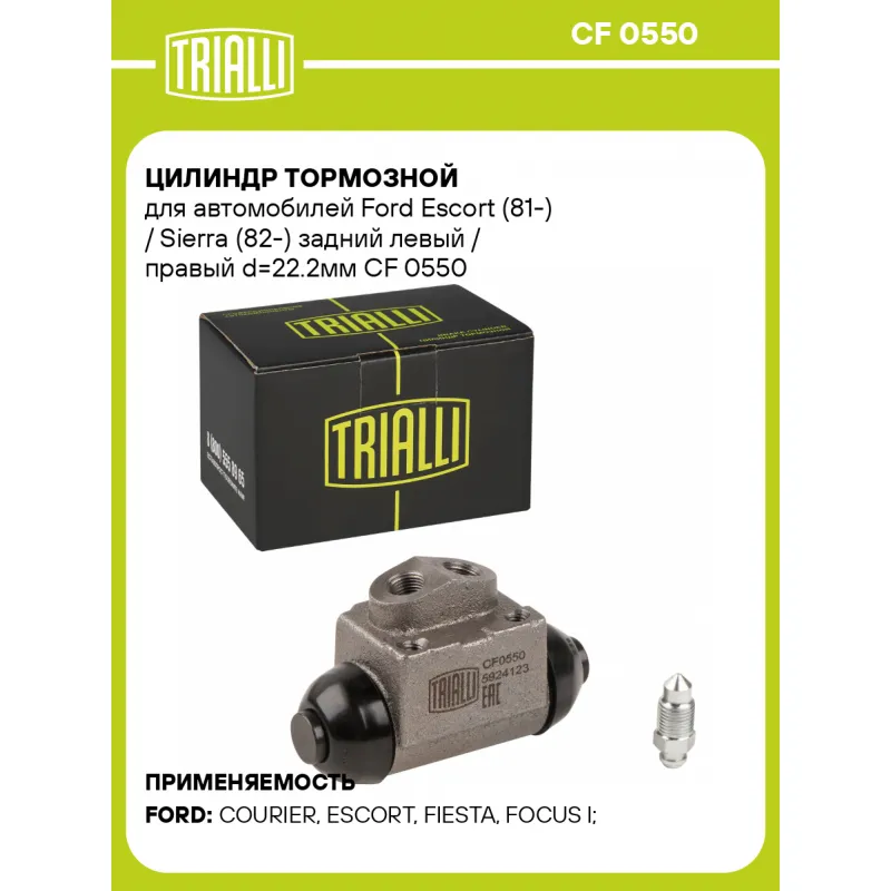 Цилиндр тормозной для автомобилей Ford Escort (81-) / Sierra (82-) задний левый / правый d=22.2мм Характеристики: Артикул: CF 0550 OEM номера: 1006012, 1113980, 1133442, 6088234, 6196053, 81AB2261AA, 95AB2261BA, 95AB2261BB, YS412261BA Сопутствующие товары: Колодки тормозные барабанные: GF 1069 Количество на автомобиль: 2 Диаметр, мм: 22.2 Тормозная система: TRW Размер резьбы: M10x1 Гарантийный срок: 2 года / 60 000 км Материал: Чугун Сторона установки: Задняя ось Товарная линейка: BLACK Комплектация: Цилиндр тормозной - 1 шт Гарантия: от 1 года.