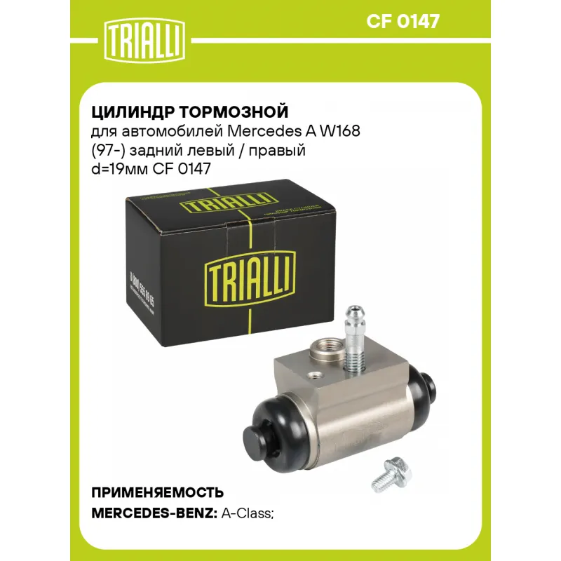 Цилиндр тормозной для автомобилей Mercedes A W168 (97-) задний левый / правый d=19мм Характеристики: Артикул: CF 0147 OEM номера: 1684200018, A 168 420 00 18 Количество на автомобиль: 2 Диаметр, мм: 19 Особенности конструкции:: Шасси до № J078973 Тормозная система: TRW Размер резьбы: M10x1 Гарантийный срок: 2 года / 60 000 км Ма... Читать полностью →