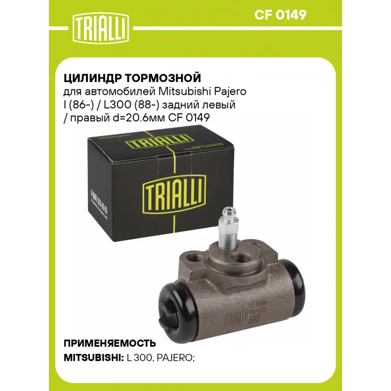 Цилиндр тормозной для автомобилей Mitsubishi Pajero I (86-) / L300 (88-) задний левый / правый d=20.6мм Характеристики: Артикул: CF 0149 OEM номера: MB238511, MB500485 Сопутствующие товары: Колодки тормозные барабанные: GF 4411 Количество на автомобиль: 2 Диаметр, мм: 20.6 Размер резьбы: M10x1 Гарантийный срок: 2 года / 60 000 км Материал: Чугун Сторона установки: Задняя ось Товарная линейка: BLACK Комплектация: Цилиндр тормозной - 1 шт Гарантия: от 1 года.