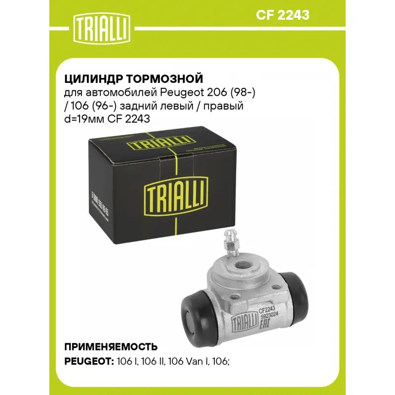Цилиндр тормозной для автомобилей Peugeot 206 (98-) / 106 (96-) задний левый / правый d=19мм Характеристики: Артикул: CF 2243 OEM номера: 440292 Особенности конструкции:: Антикоррозийное покрытие корпуса Гарантийный срок: 2 года / 60 000 км Количество на автомобиль: 2 Диаметр, мм: 19 Тормозная система: BENDIX Размер резьбы: M10x1 Материал: Чугун Сторона установки: Задняя ось Товарная линейка: BLACK Комплектация: Цилиндр тормозной - 1 шт Гарантия: от 1 года.