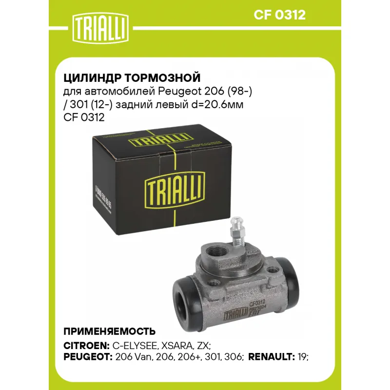 Цилиндр тормозной для автомобилей Peugeot 206 (98-) / 301 (12-) задний левый d=20.6мм Характеристики: Артикул: CF 0312 OEM номера: 95668067, 440297, 7701 039 392, 7701 035 471, 7701 033 707 Гарантийный срок: 2 года / 60 000 км Парный товар: CF 0313 Количество на автомобиль: 1 Диаметр, мм: 20.6 Тормозная система: BENDIX Размер ре... Читать полностью →
