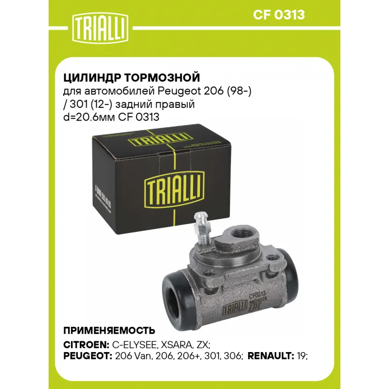 Цилиндр тормозной для автомобилей Peugeot 206 (98-) / 301 (12-) задний правый d=20.6мм Характеристики: Артикул: CF 0313 OEM номера: 440298, 95668068, 77 01 035 472, 77 01 039 393, 77 01 033 706 Парный товар: CF 0312 Количество на автомобиль: 1 Диаметр, мм: 20.6 Тормозная система: BENDIX Размер резьбы: M12x1 Гарантийный срок: 2 года / 60 000 км Материал: Чугун Сторона установки: Задний мост справа Товарная линейка: BLACK Комплектация: Цилиндр тормозной - 1 шт Гарантия: от 1 года.