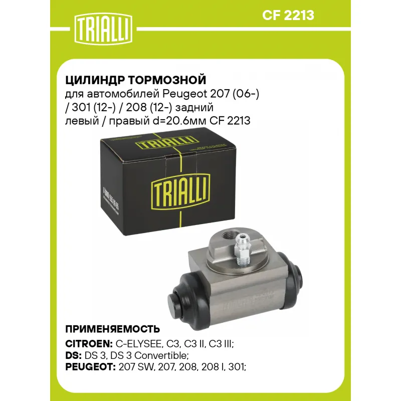 Цилиндр тормозной для автомобилей Peugeot 207 (06-) / 301 (12-) / 208 (12-) задний левый / правый d=20.6мм Характеристики: Артикул: CF 2213 OEM номера: 4402F1 Гарантийный срок: 2 года / 60 000 км Количество на автомобиль: 2 Диаметр, мм: 20.6 Тормозная система: BOSCH Размер резьбы: M10x1 Материал: Алюминий Сторона установки: Задняя ось Товарная линейка: BLACK Комплектация: Цилиндр тормозной - 1 шт Гарантия: от 1 года.