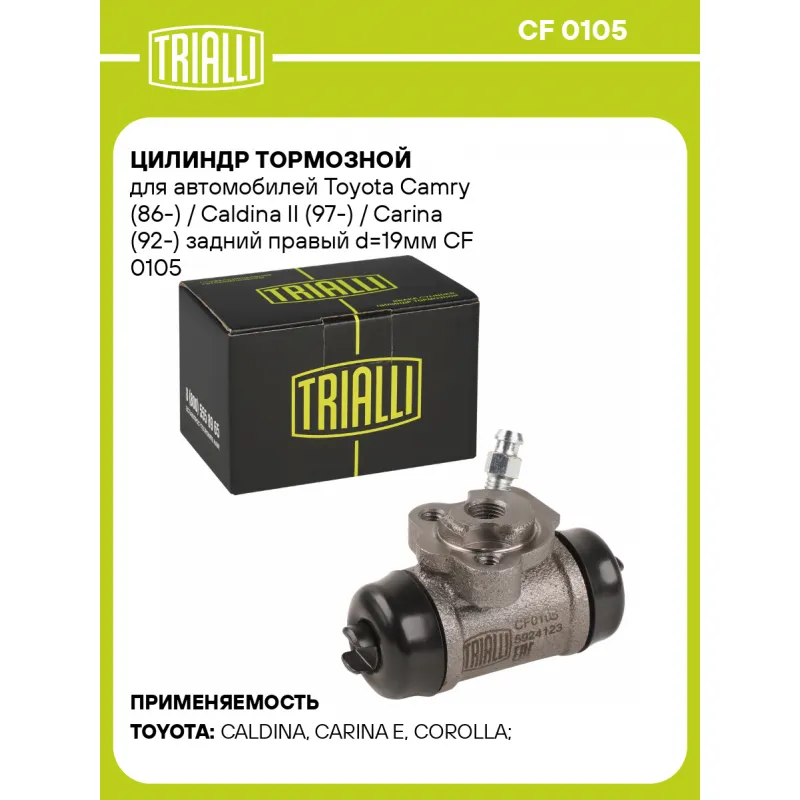 Цилиндр тормозной для автомобилей Toyota Camry (86-) / Caldina II (97-) / Carina (92-) задний правый d=19мм Характеристики: Артикул: CF 0105 OEM номера: 47550-20150 Сопутствующие товары: Колодки тормозные барабанные: GF 1905, GF1906 , GF 1909 Парный товар: CF 194301 Количество на автомобиль: 1 Диаметр, мм: 19 Тормозная система: ... Читать полностью →