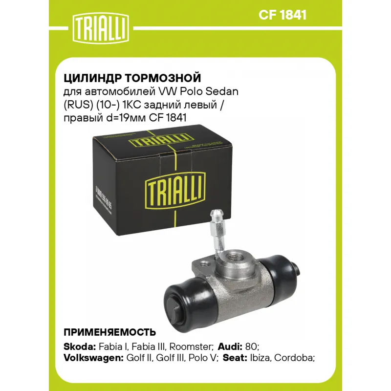 Цилиндр тормозной для автомобилей VW Polo Sedan (RUS) (10-) 1KC задний левый / правый d=19мм Характеристики: Артикул: CF 1841 OEM номера: 1H0611053, 6Q0611053B, 6QE611053A, 861611053 Сопутствующие товары: Колодки тормозные барабанные: GF 1863 Количество на автомобиль: 2 Диаметр, мм: 19 Тормозная система: FAG Размер резьбы: M10x1 Гарантийный срок: 2 года / 60 000 км Материал: Чугун Сторона установки: Задняя ось Товарная линейка: BLACK Подходит для авто: Skoda Fabia I (99-), Fabia III (14-), Roomster (06-), Fabia I (99-), Fabia II (07-), Octavia (96-), Roomster (06-) Audi 80 (86-), 80 (91-) Volkswagen Golf II (83-), Golf III (91-), Polo V (09-), Polo Sedan (RUS) (10-), Jetta (84-), Passat B3 (88-), Vento (92-), Polo V (09-) Seat Ibiza (00-), Ibiza (00-), Ibiza (08-), Cordoba (00-), Cordoba (00-) Для проверки применяемости отправьте VIN автомобиля через вкладку "Есть вопросы о товаре?" Комплектация: Цилиндр тормозной - 1 шт Гарантия: от 1 года.
