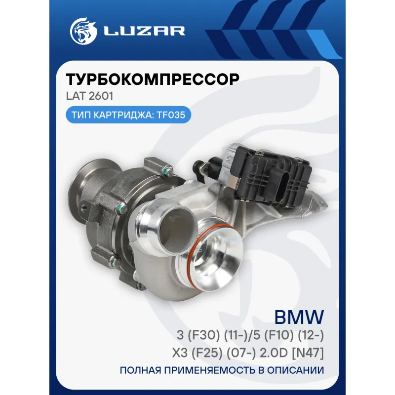 Турбокомпрессор для а/м BMW 3 (F30) (11-)/5 (F10) (12-)/X3 (F25) (07-) 2.0D [N47] (тип TF035) Характеристики: Артикул: LAT 2601 OEM номера: 11658519476, 11658517452, 11658519475, 11658513298, 11658513299, 11658517453 Количество на автомобиль: 1 Применяемость: N47 D20 C Тип картриджа: TF035 Подходит для авто: BMW X1 E84 (09-), 5 F10/F11/F07 (10-), X3 F25 (10-), 1 F20/F21 (11-), 3 F3x (11-), 4 F3x (13-) Для проверки применяемости отправьте VIN автомобиля через вкладку "Есть вопросы о товаре?" Комплектация: Турбокомпрессор Комплект прокладок - 3 шт Паспорт изделия Гарантия: от 1 года.