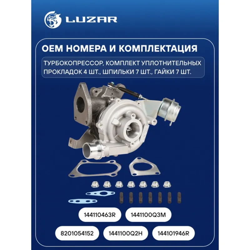Турбокомпрессор для а/м Renault Master (10-) 2.3D [M9T] Характеристики: Артикул: LAT 0910 OEM номера: 8201054152, 1441100Q2H, 144101946R, 144110463R, 1441100Q3M Количество на автомобиль: 1 Применяемость: M9T Тип картриджа: GT1546JS Сопутствующий товар: Актуатор: LTC 0910 Сопутствующий товар: Набор монтажный: LTC 09101 Подходит для авто: Renault Trafic II (01-), Master III (10-) Opel Vivaro (01-) Для проверки применяемости отправьте VIN автомобиля через вкладку "Есть вопросы о товаре?" Комплектация: Турбокомпрессор Комплект уплотнительных прокладок - 4 шт Шпильки - 7 шт Гайки - 7 шт Паспорт изделия Гарантия: от 1 года.