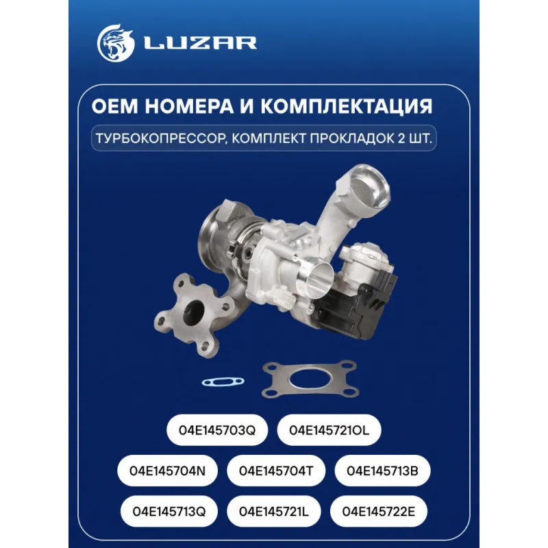 Турбокомпрессор для а/м Skoda Octavia (13-)/VW Golf VII (12-) 1.2T [CJZA] Характеристики: Артикул: LAT 1850 OEM номера: 04E145713Q, 04E145721L, 04E145722E, 04E145704N, 04E145704T, 04E145713B, 04E145703Q, 04E145721OL Количество на автомобиль: 1 Сопутствующий товар: Радиаторы интеркулера (онв): LRIC 189C Применяемость: CJZA, CJZB, CMBA, CXSA, CZCA, CZDA, CZEA DJKA Подходит для авто: Audi A3 (12-) Skoda Octavia A7 (13-) Volkswagen Golf VII (12-) Seat Leon (12-) Для проверки применяемости отправьте VIN автомобиля через вкладку "Есть вопросы о товаре?" Комплектация: Турбокомпрессор - 1 шт Комплект прокладок - 2 шт Паспорт изделия - 1 шт Гарантия: от 1 года.