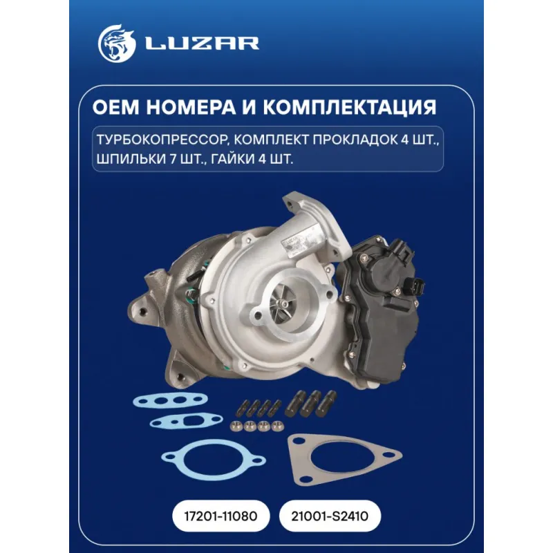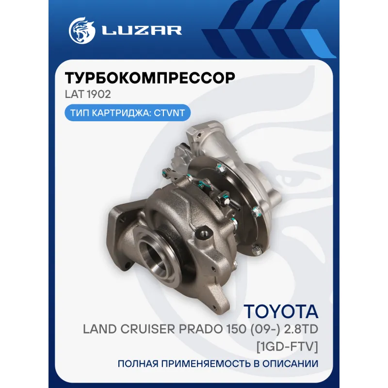 Турбокомпрессор для автомобилей Toyota Land Cruiser Prado 150 (09-) 2.8TD [1GD-FTV] (тип CT VNT) Характеристики: Артикул: LAT 1902 OEM номера: 17201-11080, 21001-S2410 Количество на автомобиль: 1 Применяемость: 1GD-FTV Тип картриджа: CTVNT Подходит для авто: Toyota Land Cruiser Prado 150 (09-), Hilux (15-), Fortuner (15-) Для проверки применяемости отправьте VIN автомобиля через вкладку "Есть вопросы о товаре?" Комплектация: Турбокомпрессор Комплект прокладок - 4 шт Шпильки - 7 шт Гайки - 4 шт Паспорт изделия Гарантия: от 1 года.