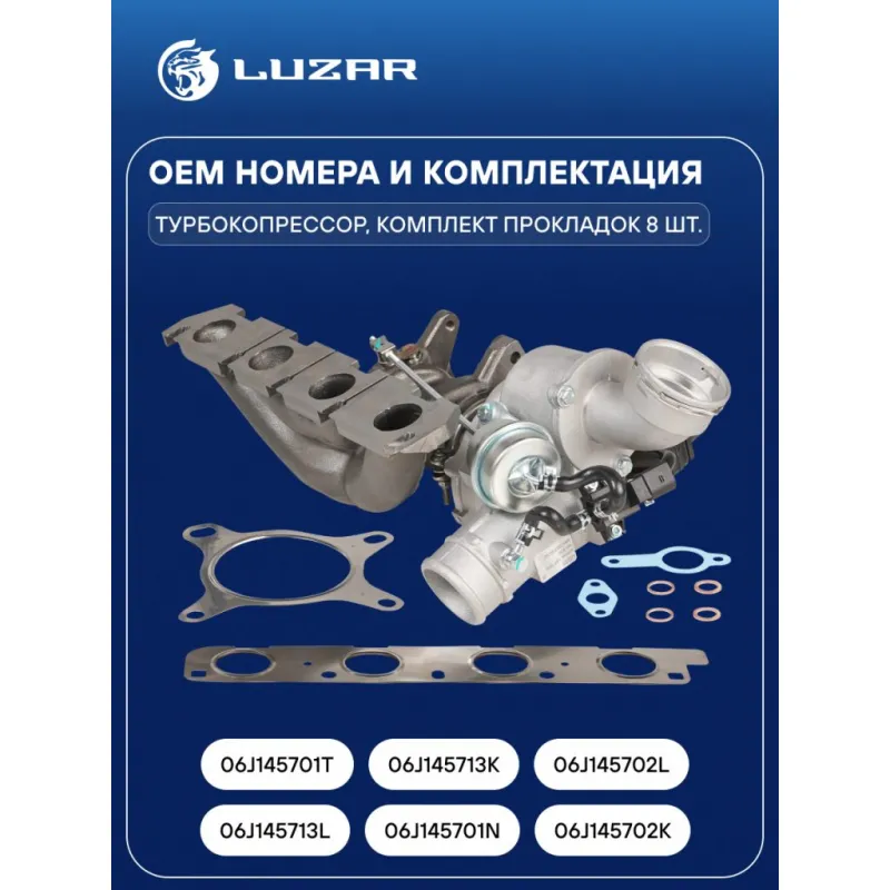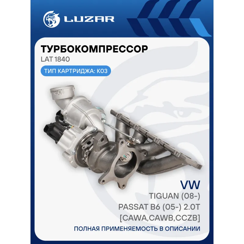 Турбокомпрессор для автомобилей VW Tiguan (08-)/Passat B6 (05-) 2.0T [CAWA,CAWB,CCZB] (тип K03) Характеристики: Артикул: LAT 1840 OEM номера: 06J145713L, 06J145701N, 06J145702K, 06J145701T, 06J145713K, 06J145702L Количество на автомобиль: 1 Применяемость: [CAWA;CAWB;CCZB] Тип картриджа: K03 Подходит для авто: Volkswagen Tiguan (08-), Passat B6 (05-) Skoda Superb II (08-), Octavia A5 (04-) Audi Q3 (11-) Для проверки применяемости отправьте VIN автомобиля через вкладку "Есть вопросы о товаре?" Комплектация: Ткрбокомпрессор Комплект прокладок - 8 шт Паспорт изделия Гарантия: от 1 года.