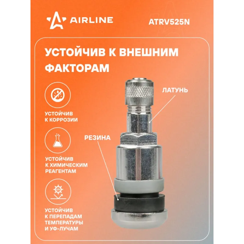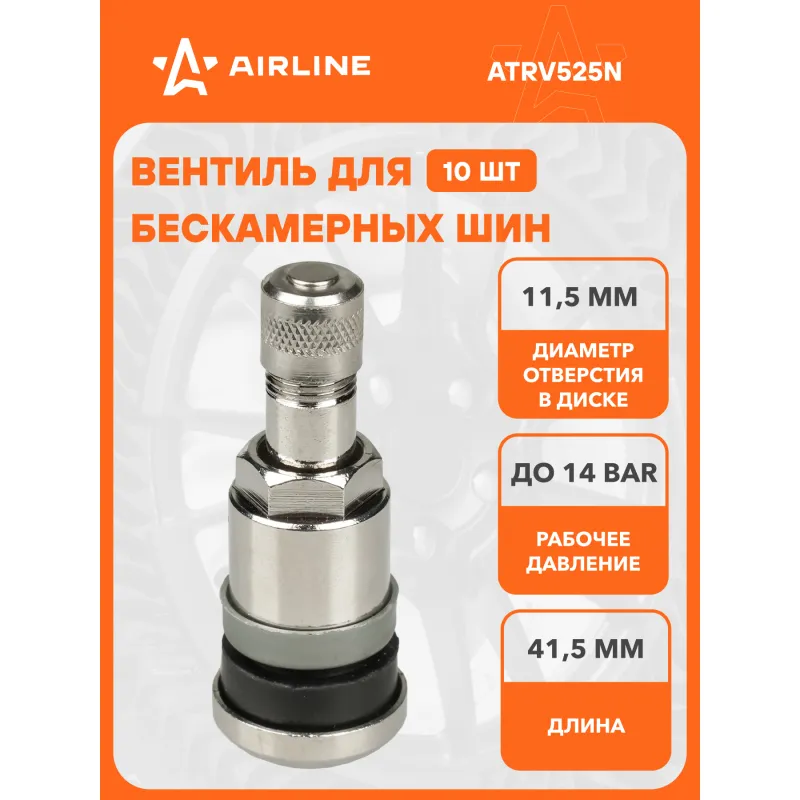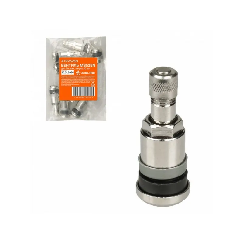Вентиль для б/к шин MS525N, латунь Описание: Колесный шинный вентиль для бескамерных шин ATRV525N от бренда AIRLINE представляет собой комплект 10 шт обратный клапан и является главным расходным материалом для шиномонтажа, при ремонте и межсезонной смене шин легковых и грузовых автомобилей. Ниппель для бескамерных шин предназначен для нагнетания и удержания воздуха внутри шины. Корпус, золотник и колпачок выполнены из латуни, прокладка - из резины. Особенности: Диаметр отверстия в диске, 11,5 мм; Рабочее давление, 14 Bar; Длина вентиля, 41,5 мм; Обеспечивает высокую герметичность, прочность; Изготовлены из высококачественных материалов - Латунь, резина; Устойчивы к износу и коррозии; Удобен в использовании для профессионалов и любителей; Помимо автомобилей вентиля подходят для мотоциклов, квардроциклов, прицепов, снегоуборочной техники. Товар официального производителя AIRLINE. Характеристики: Артикул: ATRV525N Диаметр отверстия в диске, мм: 11,5 Рабочее давление, Bar: 14 Длина, мм: 41,5 Комплектация: Вентиль - 1 шт Гарантия: от 1 года.
