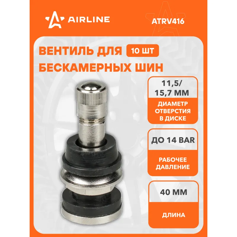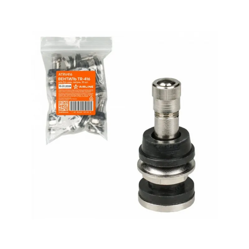 Вентиль для б/к шин TR-416, латунь Описание: Колесный шинный вентиль для бескамерных шин ATRV416 от бренда AIRLINE представляет собой комплект 10 шт обратный клапан и является главным расходным материалом для шиномонтажа, при ремонте и межсезонной смене шин легковых и грузовых автомобилей. Ниппель для бескамерных шин предназначен для нагнетания и удержания воздуха внутри шины. Корпус, золотник и колпачок выполнены из латуни, прокладка - из резины. Особенности: Диаметр отверстия в диске, ; Рабочее давление, 14 Bar; Длина вентиля, 40 мм; Обеспечивает высокую герметичность, прочность; Изготовлены из высококачественных материалов - Латунь, резина; Устойчивы к износу и коррозии; Удобен в использовании для профессионалов и любителей; Помимо автомобилей вентиля подходят для мотоциклов, квардроциклов, прицепов, снегоуборочной техники. Товар официального производителя AIRLINE. Характеристики: Артикул: ATRV416 Рабочее давление, Bar: 14 Длина, мм: 40 Диаметр отверстия в диске 1, мм: 11,5 Диаметр отверстия в диске 2, мм: 15,7 Комплектация: Вентиль - 1 шт Гарантия: от 1 года.