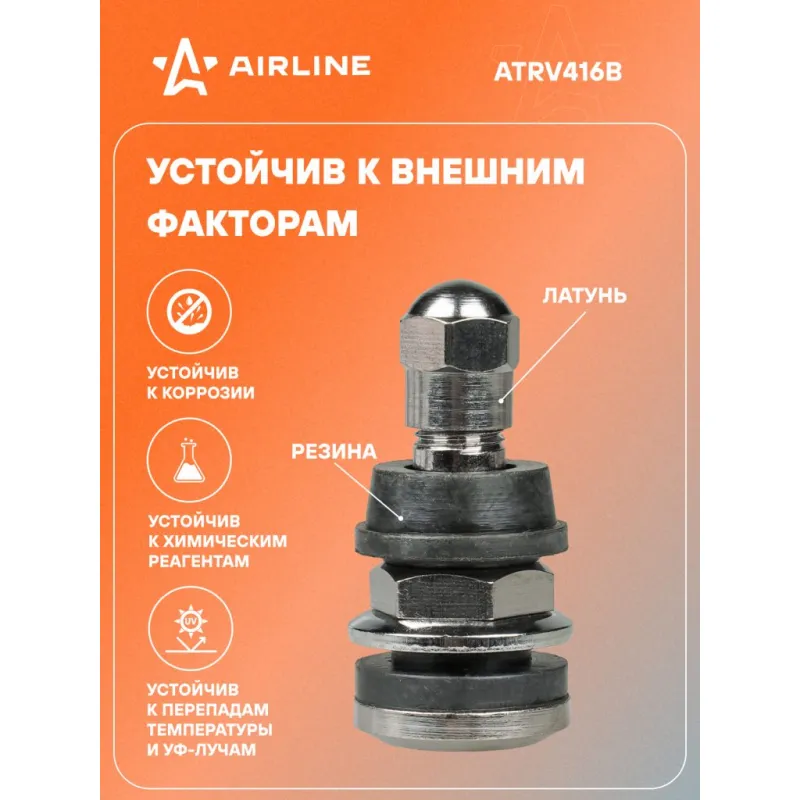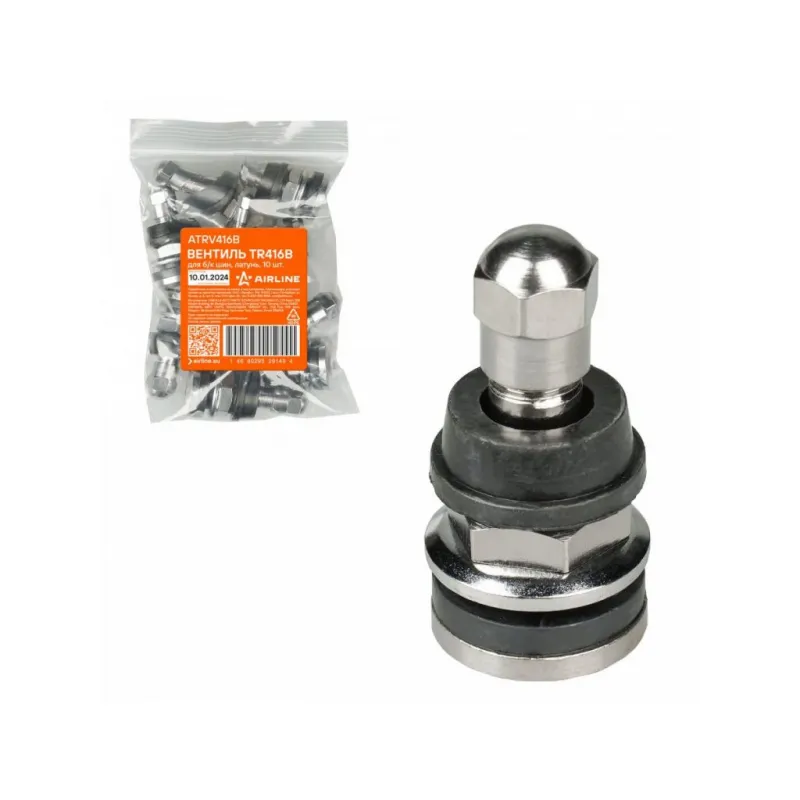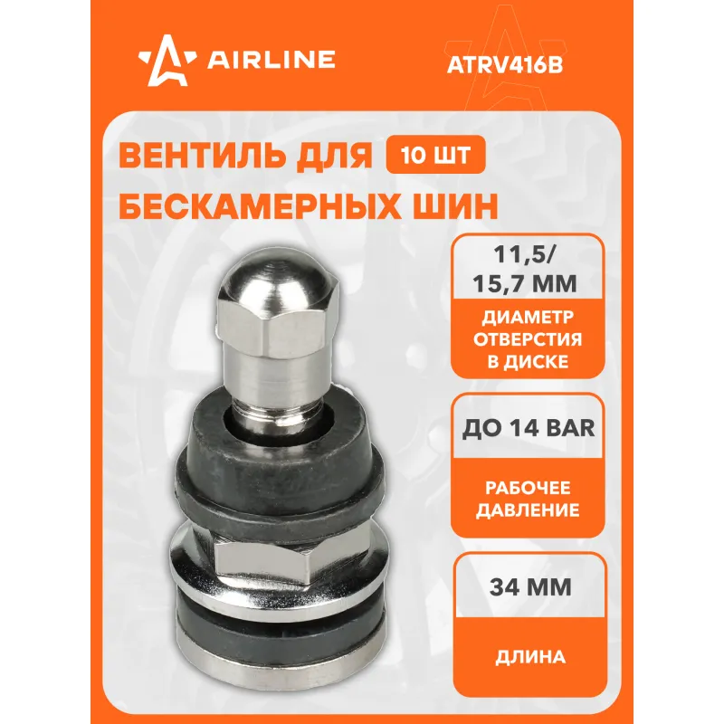 Вентиль для б/к шин TR416B, латунь Описание: Колесный шинный вентиль для бескамерных шин ATRV416B от бренда AIRLINE представляет собой комплект 10 шт обратный клапан и является главным расходным материалом для шиномонтажа, при ремонте и межсезонной смене шин легковых и грузовых автомобилей. Ниппель для бескамерных шин предназначен для нагнетания и удержания воздуха внутри шины. Корпус, золотник и колпачок выполнены из латуни, прокладка - из резины. Особенности: Диаметр отверстия в диске, ; Рабочее давление, 14 Bar; Длина вентиля, 34 мм; Обеспечивает высокую герметичность, прочность; Изготовлены из высококачественных материалов - Латунь, резина; Устойчивы к износу и коррозии; Удобен в использовании для профессионалов и любителей; Помимо автомобилей вентиля подходят для мотоциклов, квардроциклов, прицепов, снегоуборочной техники. Товар официального производителя AIRLINE. Характеристики: Артикул: ATRV416B Рабочее давление, Bar: 14 Длина, мм: 34 Диаметр отверстия в диске 1, мм: 11,5 Диаметр отверстия в диске 2, мм: 15,7 Комплектация: Вентиль - 1 шт Гарантия: от 1 года.