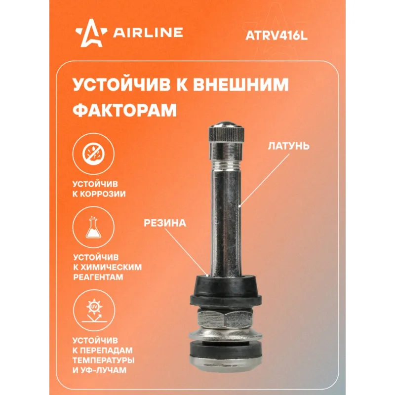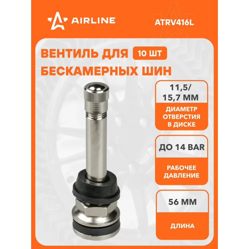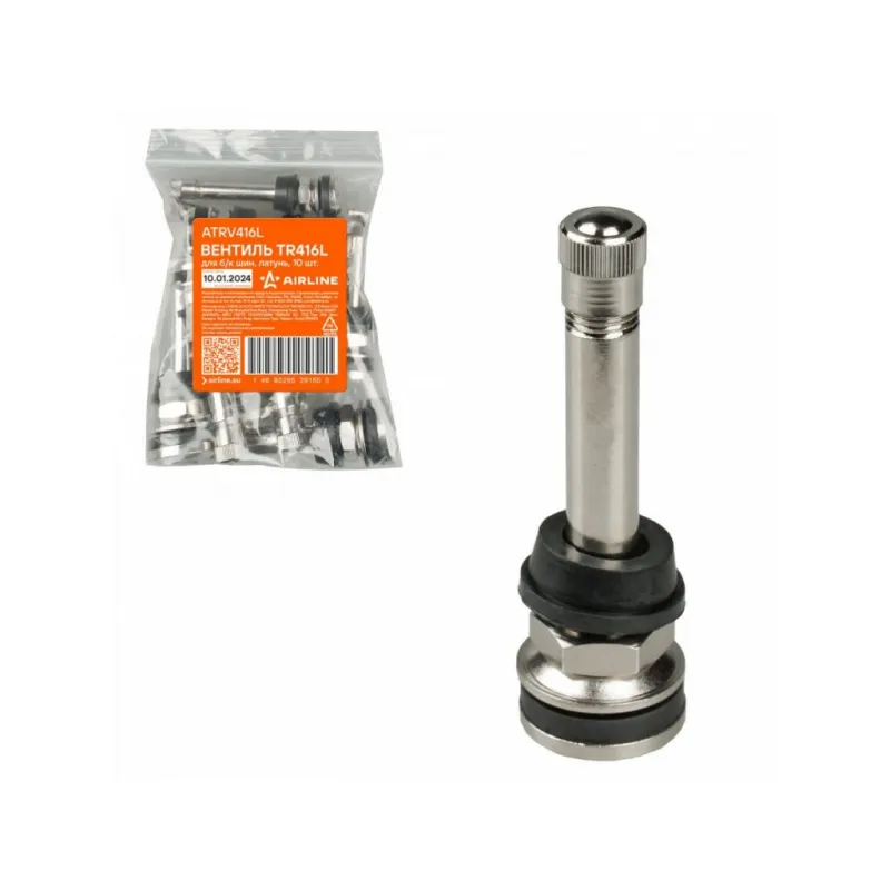 Вентиль для б/к шин TR416L, латунь Описание: Колесный шинный вентиль для бескамерных шин ATRV416L от бренда AIRLINE представляет собой комплект 10 шт обратный клапан и является главным расходным материалом для шиномонтажа, при ремонте и межсезонной смене шин легковых и грузовых автомобилей. Ниппель для бескамерных шин предназначен для нагнетания и удержания воздуха внутри шины. Корпус, золотник и колпачок выполнены из латуни, прокладка - из резины. Особенности: Диаметр отверстия в диске, ; Рабочее давление, 14 Bar; Длина вентиля, 56 мм; Обеспечивает высокую герметичность, прочность; Изготовлены из высококачественных материалов - Латунь, резина; Устойчивы к износу и коррозии; Удобен в использовании для профессионалов и любителей; Помимо автомобилей вентиля подходят для мотоциклов, квардроциклов, прицепов, снегоуборочной техники. Товар официального производителя AIRLINE. Характеристики: Артикул: ATRV416L Рабочее давление, Bar: 14 Длина, мм: 56 Диаметр отверстия в диске 1, мм: 11,5 Диаметр отверстия в диске 2, мм: 15,7 Комплектация: Вентиль - 1 шт Гарантия: от 1 года.