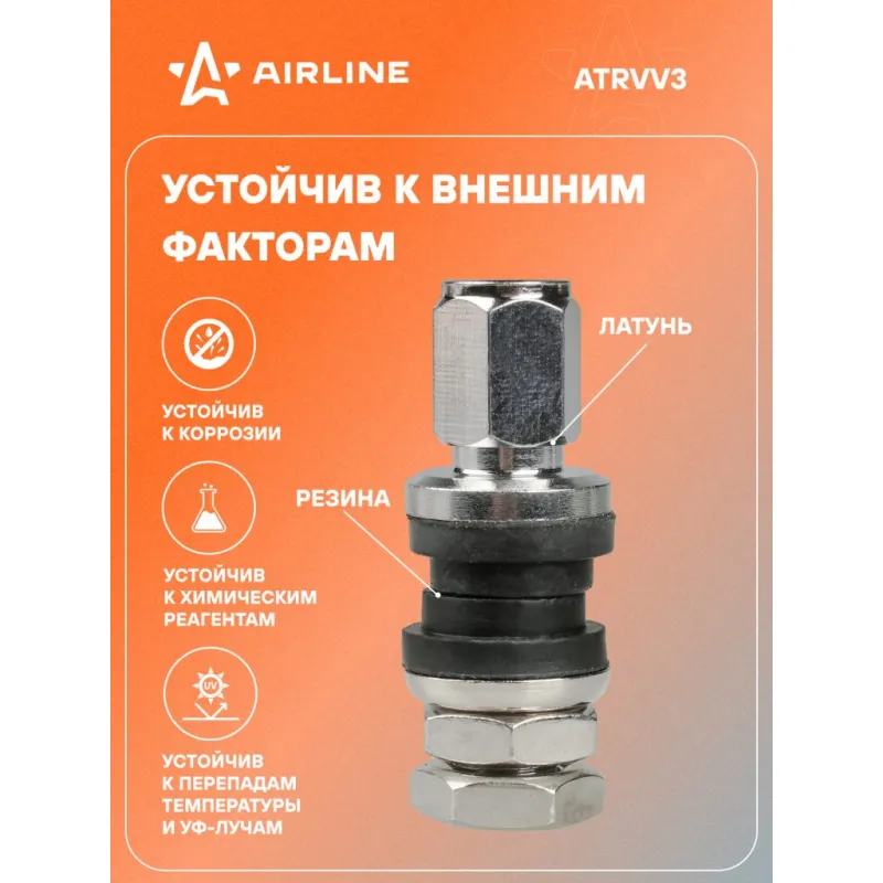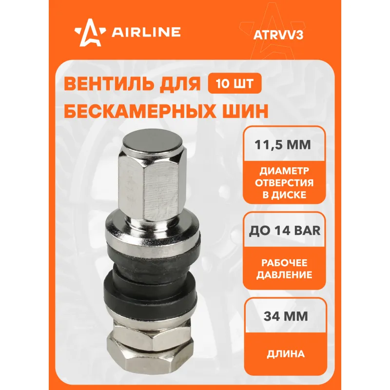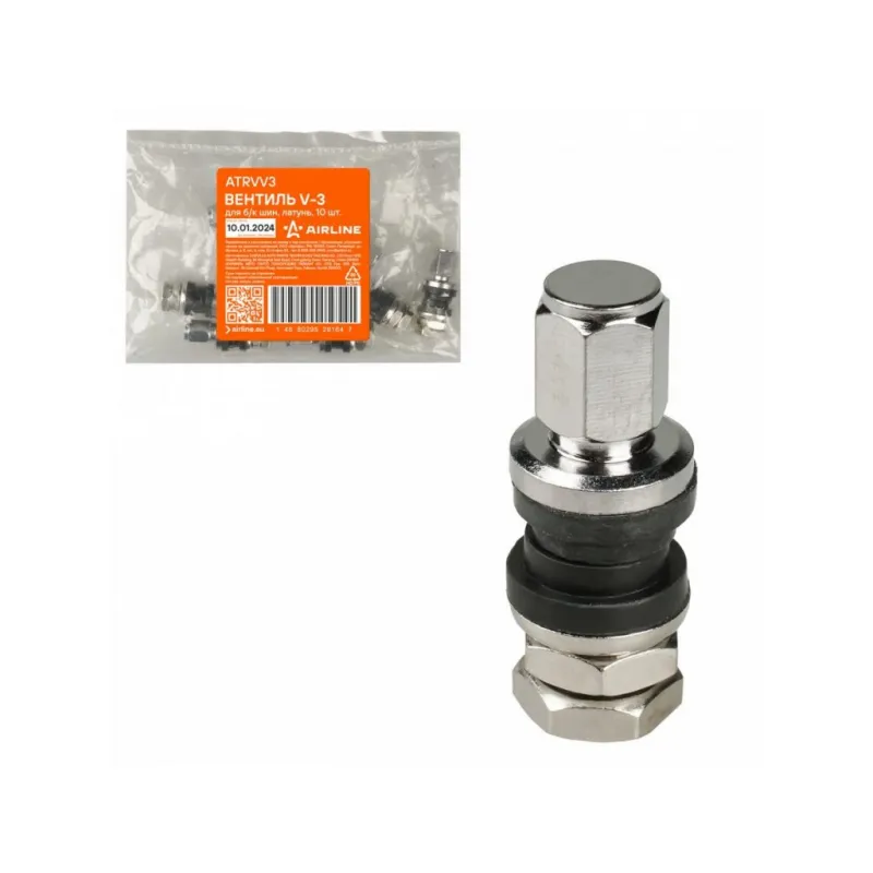 Вентиль для б/к шин V-3, латунь Описание: Колесный шинный вентиль для бескамерных шин ATRVV3 от бренда AIRLINE представляет собой комплект 10 шт обратный клапан и является главным расходным материалом для шиномонтажа, при ремонте и межсезонной смене шин легковых и грузовых автомобилей. Ниппель для бескамерных шин предназначен для нагнетания и удержания воздуха внутри шины. Корпус, золотник и колпачок выполнены из латуни, прокладка - из резины. Особенности: Диаметр отверстия в диске, 11,5 мм; Рабочее давление, 14 Bar; Длина вентиля, 34 мм; Обеспечивает высокую герметичность, прочность; Изготовлены из высококачественных материалов - Латунь, резина; Устойчивы к износу и коррозии; Удобен в использовании для профессионалов и любителей; Помимо автомобилей вентиля подходят для мотоциклов, квардроциклов, прицепов, снегоуборочной техники. Товар официального производителя AIRLINE. Характеристики: Артикул: ATRVV3 Диаметр отверстия в диске, мм: 11,5 Рабочее давление, Bar: 14 Длина, мм: 34 Комплектация: Вентиль - 1 шт Гарантия: от 1 года.
