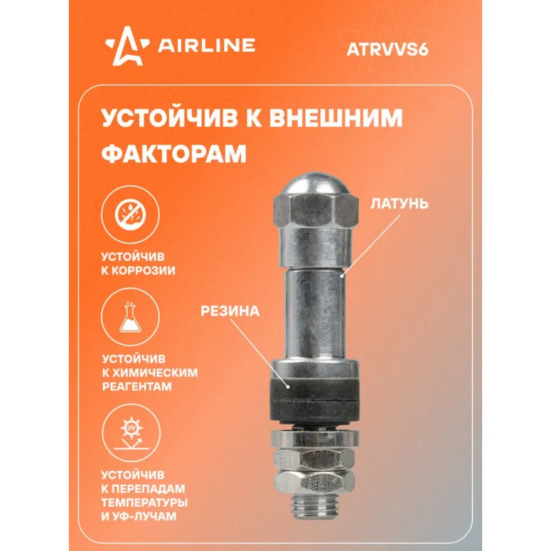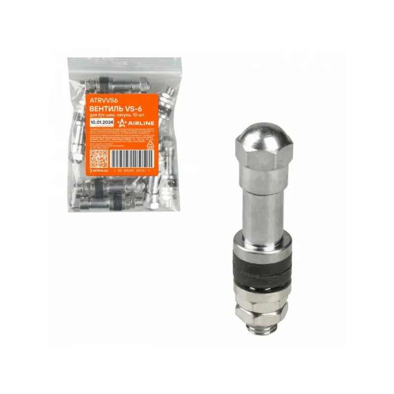 Вентиль для б/к шин VS-6, латунь Описание: Колесный шинный вентиль для бескамерных шин ATRVVS6 от бренда AIRLINE представляет собой комплект 10 шт обратный клапан и является главным расходным материалом для шиномонтажа, при ремонте и межсезонной смене шин легковых и грузовых автомобилей. Ниппель для бескамерных шин предназначен для нагнетания и удержания воздуха внутри шины. Корпус, золотник и колпачок выполнены из латуни, прокладка - из резины. Особенности: Диаметр отверстия в диске, 6 мм; Рабочее давление, 14 Bar; Длина вентиля, 40 мм; Обеспечивает высокую герметичность, прочность; Изготовлены из высококачественных материалов - латунь, резина; Устойчивы к износу и коррозии; Удобен в использовании для профессионалов и любителей; Помимо автомобилей вентиля подходят для мотоциклов, квардроциклов, прицепов, снегоуборочной техники. Товар официального производителя AIRLINE. Характеристики: Артикул: ATRVVS6 Диаметр отверстия в диске, мм: 6 Рабочее давление, Bar: 14 Длина, мм: 40 Комплектация: Вентиль - 1 шт Гарантия: от 1 года.