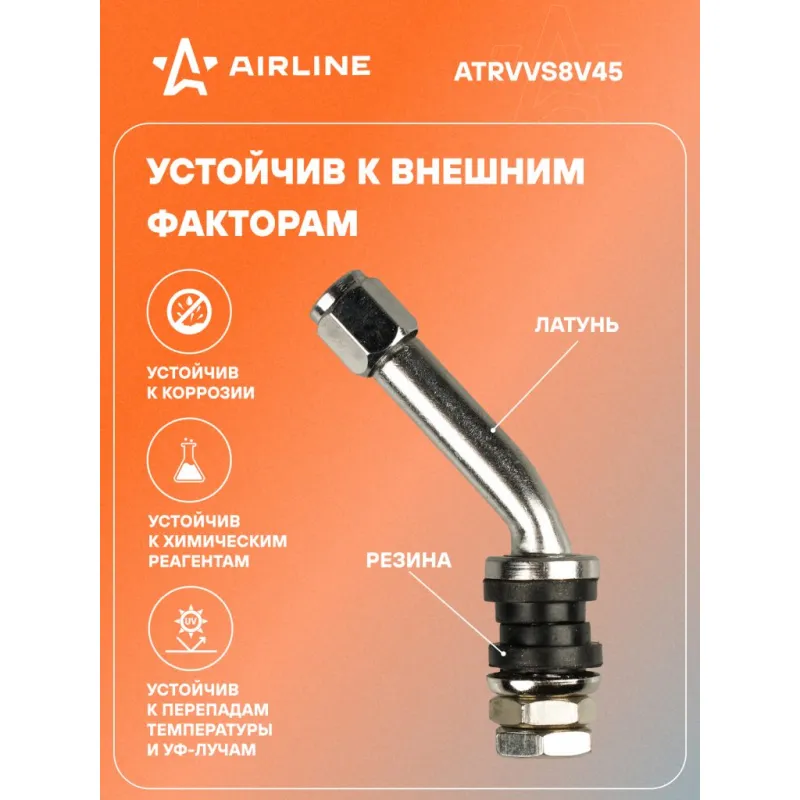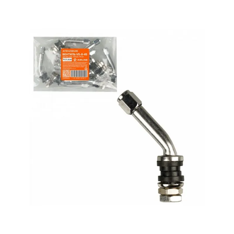 Вентиль для б/к шин VS-8-45, латунь Описание: Колесный шинный вентиль для бескамерных шин ATRVVS8V45 от бренда AIRLINE представляет собой комплект 10 шт обратный клапан и является главным расходным материалом для шиномонтажа, при ремонте и межсезонной смене шин легковых и грузовых автомобилей. Ниппель для бескамерных шин предназначен для нагнетания и удержания воздуха внутри шины. Корпус, золотник и колпачок выполнены из латуни, прокладка - из резины. Особенности: Диаметр отверстия в диске, 11,5 мм; Рабочее давление, 14 Bar; Длина вентиля, 51,5 мм; Обеспечивает высокую герметичность, прочность; Изготовлены из высококачественных материалов - Латунь, резина; Устойчивы к износу и коррозии; Удобен в использовании для профессионалов и любителей; Помимо автомобилей вентиля подходят для мотоциклов, квардроциклов, прицепов, снегоуборочной техники. Товар официального производителя AIRLINE. Характеристики: Артикул: ATRVVS8V45 Диаметр отверстия в диске, мм: 11,5 Рабочее давление, Bar: 14 Длина, мм: 51,5 Комплектация: Вентиль - 1 шт Гарантия: от 1 года.