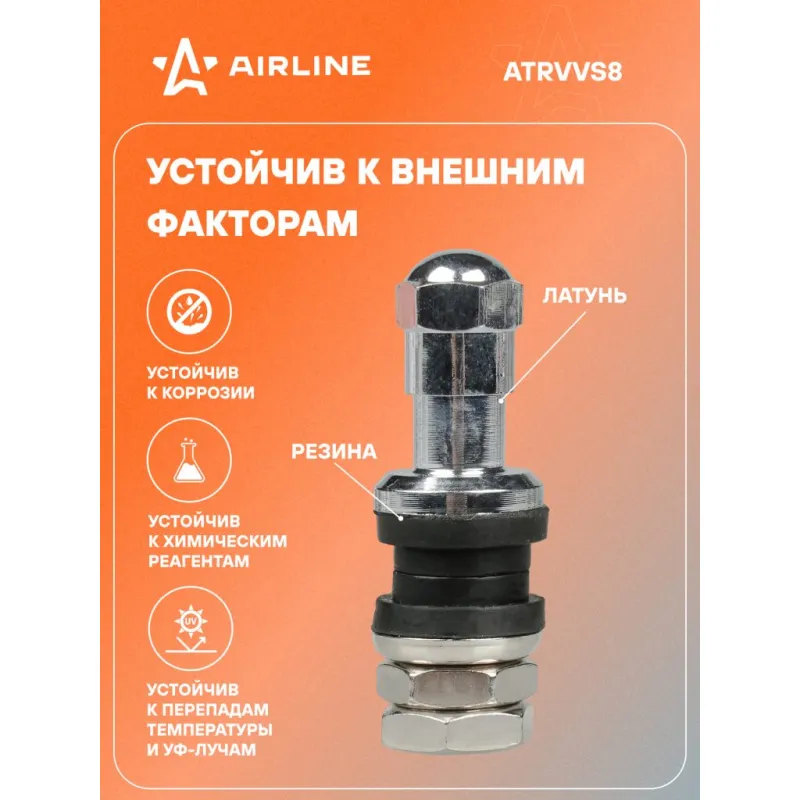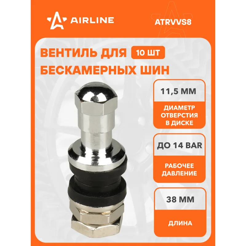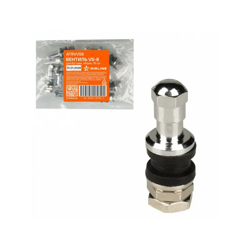 Вентиль для б/к шин VS-8, латунь Описание: Колесный шинный вентиль для бескамерных шин ATRVVS8 от бренда AIRLINE представляет собой комплект 10 шт обратный клапан и является главным расходным материалом для шиномонтажа, при ремонте и межсезонной смене шин легковых и грузовых автомобилей. Ниппель для бескамерных шин предназначен для нагнетания и удержания воздуха внутри шины. Корпус, золотник и колпачок выполнены из латуни, прокладка - из резины. Особенности: Диаметр отверстия в диске, 11,5 мм; Рабочее давление, 14 Bar; Длина вентиля, 38 мм; Обеспечивает высокую герметичность, прочность; Изготовлены из высококачественных материалов - Латунь, резина; Устойчивы к износу и коррозии; Удобен в использовании для профессионалов и любителей; Помимо автомобилей вентиля подходят для мотоциклов, квардроциклов, прицепов, снегоуборочной техники. Товар официального производителя AIRLINE. Характеристики: Артикул: ATRVVS8 Диаметр отверстия в диске, мм: 11,5 Рабочее давление, Bar: 14 Длина, мм: 38 Комплектация: Вентиль - 1 шт Гарантия: от 1 года.