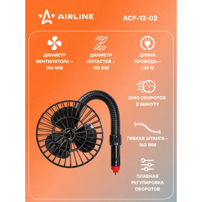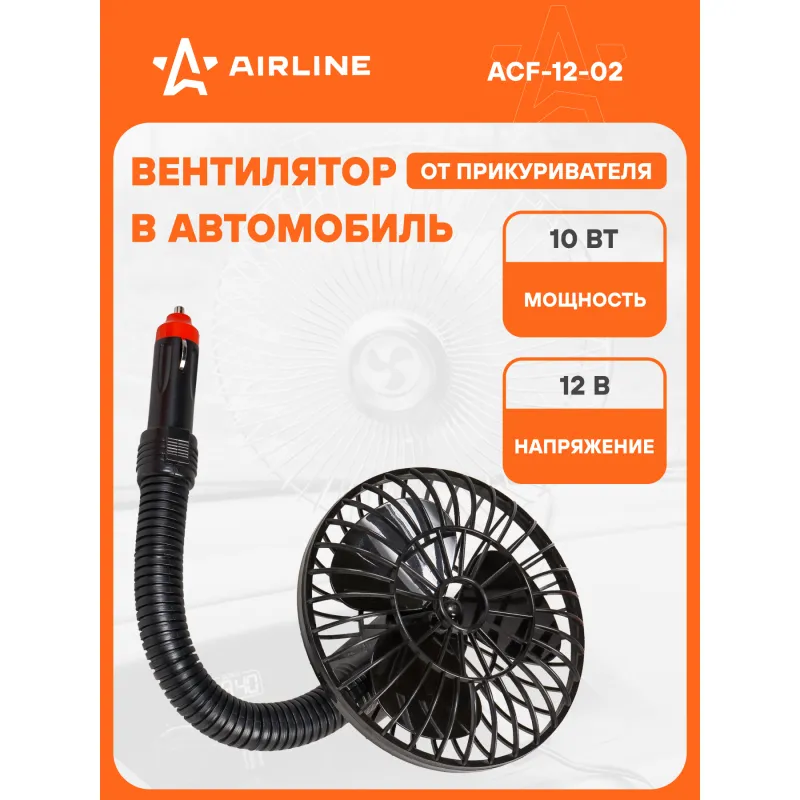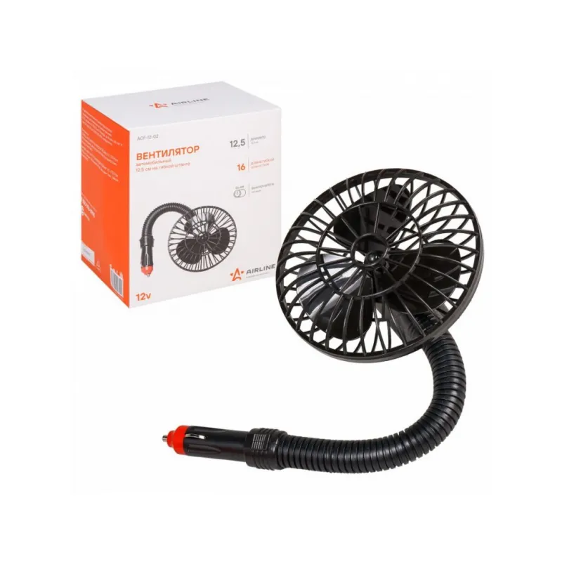Вентилятор в салон 12,5см 12В, гибкая штанга, в прикуриватель Описание: Вентилятор в машину от прикуривателя 12 В на гибкой штанге AIRLINE ACF-12-02, осевой, предназначен для обдува воздухом водителя и/или пассажиров в жаркую погоду. Устанавливается в гнездо прикуривателя на гибкой штанге. Питание от розетки прикуривателя автомобиля. Компактный вентилятор предназначен для обдува воздухом водителя и пассажиров в автомобиле, грузовике, автобусе, тракторе. Особенности: *Диаметр - ; *Длина гибкой штанги - 0,16 м; *Питание от прикуривателя 12 В; *Мощность - 10 Вт; *Оборотов в минуту - 2050; *Имеет выключатель питания и надежный штекер. Инструкция! Для включения устройства, подключите штекер в гнездо прикуривателя автомобиля, нажмите на кнопку включения. Стильный компактный вентилятор в машину или автодом подарит возможность комфортно путешествовать в машине, для повседневных поездок летом в жаркую погоду, помогает циркуляции воздуха и будет отличным приобретением в подарок владельцу автомобиля, мужчине и женщине, автолюбителю, папе, отцу, мужу, парню и другу. Товар официального производителя AIRLINE. Характеристики: Артикул: ACF-12-02 Мощность, Вт: 10 Длина провода, м: 0,16 Напряжение питания, В: 12 Диаметр вентилятора, мм: 140 Диаметр лопастей, мм: 125 Количество вентиляторов, шт: 1 Тип вентилятора: Осевой Комплектация: Вентилятор - 1 шт Картонная коробка - 1 шт Гарантия: от 1 года.