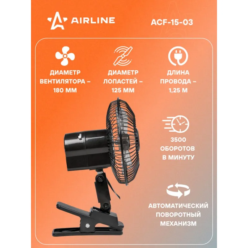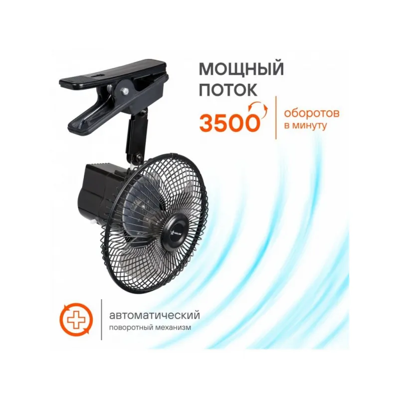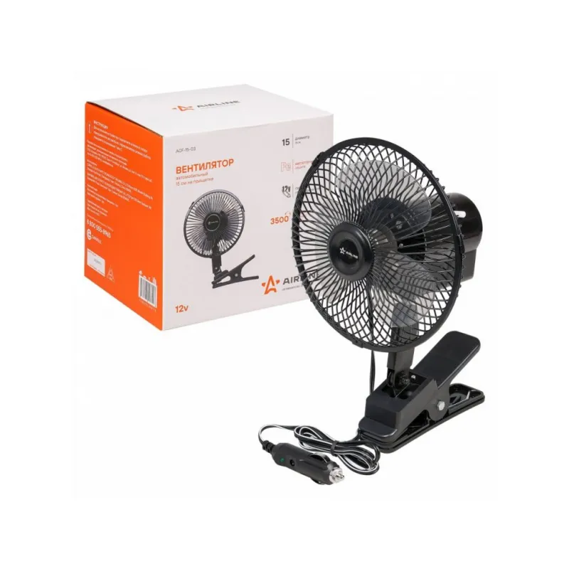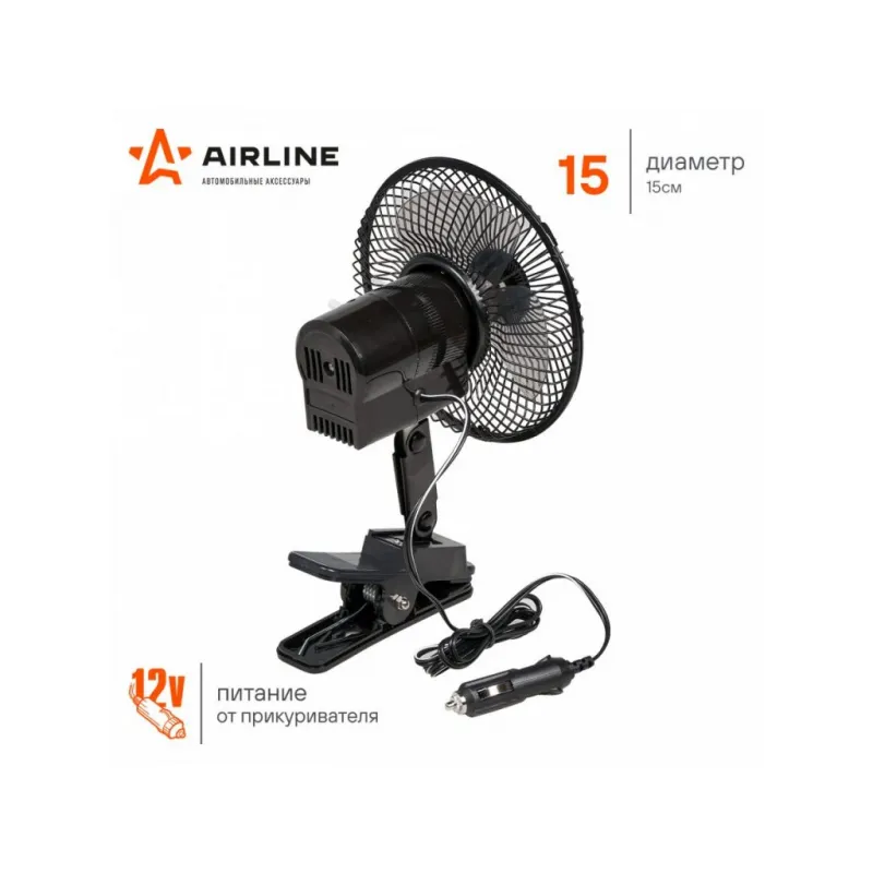 Вентилятор в салон 15см 12В, с автоповоротом, металл.корпус, прищепка Описание: Вентилятор в машину от прикуривателя 12 В на прищепке AIRLINE ACF-15-03, осевой, предназначен для обдува воздухом водителя и/или пассажиров в жаркую погоду. Имеет автоматический поворотный механизм для равномерного обдува. Вентилятор надежно устанавливается с помощью крепления - прищепки с прорезиненными накладками антискольжения. Лопасти вентилятора защищены металлическим кожухом. Питание от розетки прикуривателя автомобиля. Компактный вентилятор предназначен для обдува воздухом водителя и пассажиров в автомобиле, грузовике, автобусе, тракторе. Особенности: *Диаметр - ; *Длина провода - 1,25 м; *Питание от прикуривателя 12 В; *Мощность - 15 Вт; *Оборотов в минуту - 3500; *Имеет выключатель питания и надежный штекер. Инструкция! Для включения устройства, подключите штекер в гнездо прикуривателя автомобиля, нажмите на кнопку включения. Стильный компактный вентилятор в машину или автодом подарит возможность комфортно путешествовать в машине, для повседневных поездок летом в жаркую погоду, помогает циркуляции воздуха и будет отличным приобретением в подарок владельцу автомобиля, мужчине и женщине, автолюбителю, папе, отцу, мужу, парню и другу. Товар официального производителя AIRLINE. Характеристики: Артикул: ACF-15-03 Мощность, Вт: 15 Длина провода, м: 1,25 Напряжение питания, В: 12 Диаметр вентилятора, мм: 180 Диаметр лопастей, мм: 150 Количество вентиляторов, шт: 1 Тип вентилятора: Осевой Комплектация: Вентилятор - 1 шт Картонная коробка - 1 шт Гарантия: от 1 года.