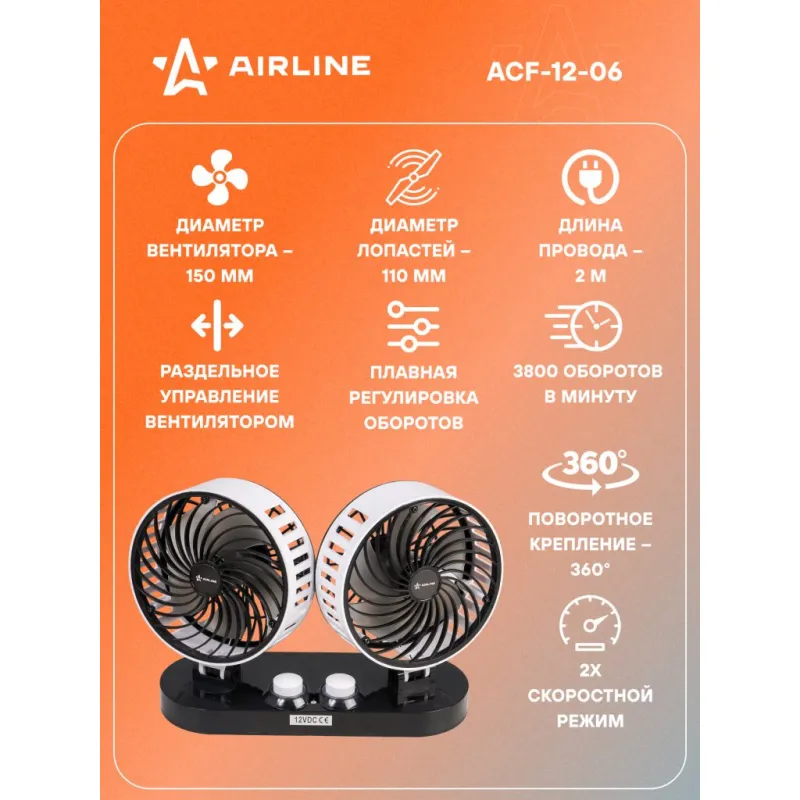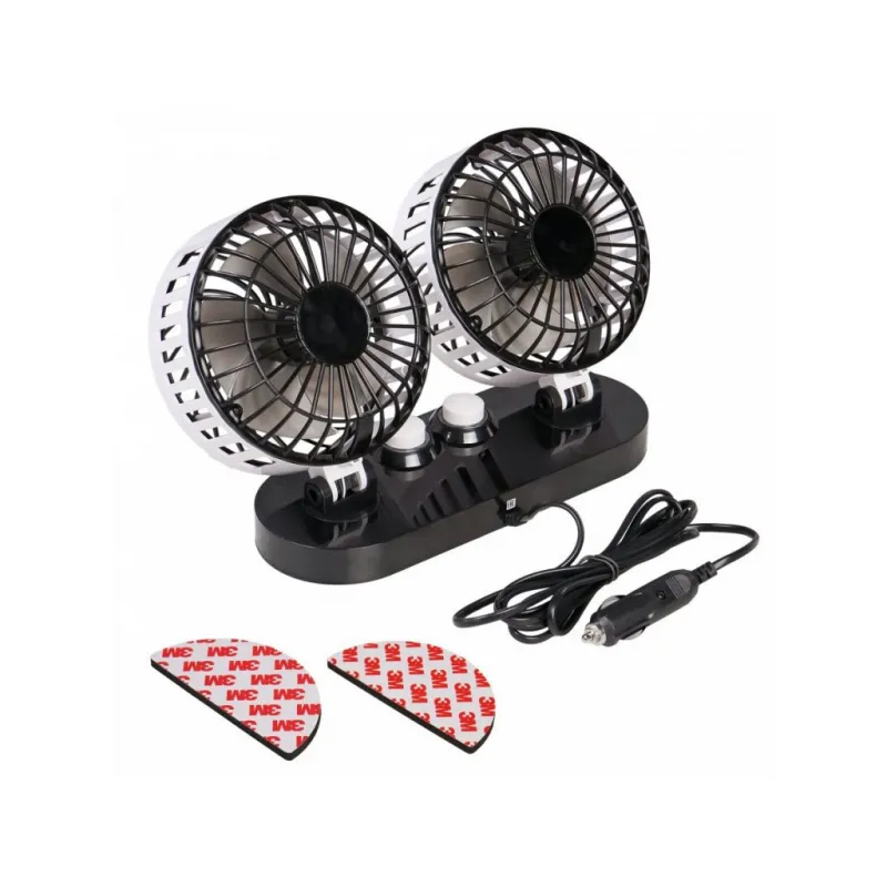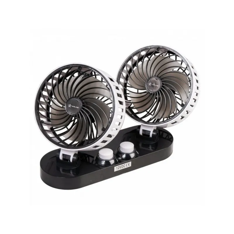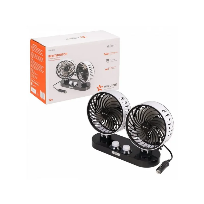 Вентилятор в салон двойной 2x15см 12В, раздельная регулировка, скотч Описание: Двойной вентилятор в машину от прикуривателя 12 В на липкой ленте AIRLINE ACF-12-06, осевой, предназначен для обдува воздухом водителя и/или пассажиров в жаркую погоду. Крепится на панель приборов или любую поверхность с помощью липкой ленты. Имеет выключатель питания с регулировкой для каждого вентилятора и надёжный штекер. Лопасти вентилятора защищены металлическим кожухом. Питание от розетки прикуривателя автомобиля. Компактный вентилятор предназначен для обдува воздухом водителя и пассажиров в автомобиле, грузовике, автобусе, на катере, автобусе, тракторе. Особенности: *Диаметр - ; *Раздельное управление вентиляторами; *Плавная регулировка оборотов; *Поворотное крепление 360 градусов; *Длина провода - 2 м; *Питание от прикуривателя 12 В; *Мощность - 20 Вт; *Оборотов в минуту - 3800; Инструкция! Для включения устройства, подключите штекер в гнездо прикуривателя автомобиля, нажмите на кнопку включения. Стильный компактный вентилятор в машину или автодом подарит возможность комфортно путешествовать в машине, для повседневных поездок летом в жаркую погоду, помогает циркуляции воздуха и будет отличным приобретением в подарок владельцу автомобиля, мужчине и женщине, автолюбителю, папе, отцу, мужу, парню и другу. Товар официального производителя AIRLINE. Характеристики: Артикул: ACF-12-06 Мощность, Вт: 20 Длина провода, м: 2 Напряжение питания, В: 12 Диаметр вентилятора, мм: 150 Диаметр лопастей, мм: 120 Количество вентиляторов, шт: 2 Тип вентилятора: Осевой Комплектация: Вентилятор - 1 шт Липкая лента для крепления - 2 шт Картонная коробка - 1 шт Гарантия: от 1 года.