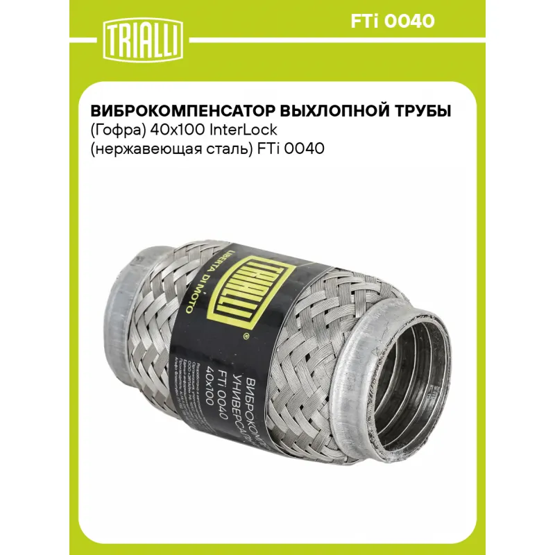Виброкомпенсатор выхлопной трубы (Гофра) 40x100 InterLock (нержавеющая сталь) Характеристики: Артикул: FTi 0040 OEM номера: 40-100, 40x100 Гарантийный срок: 2 года/60 тыс. Количество на автомобиль: 1 Тип конструкции: InterLock Особенности конструкции:: Трёхслойная Размер ID/NL, мм: 40/100 Под трубу диаметром, мм: 38-40 Длина изд... Читать полностью →
