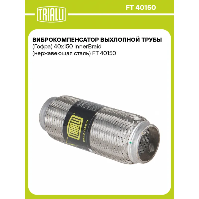 Виброкомпенсатор выхлопной трубы (Гофра) 40x150 InnerBraid (нержавеющая сталь) Характеристики: Артикул: FT 40150 OEM номера: 40-150, 40x150 Гарантийный срок: 2 года/60 тыс. Количество на автомобиль: 1 Тип конструкции: InnerBraid Особенности конструкции:: Трёхслойная Размер ID/NL, мм: 40/150 Под трубу диаметром, мм: 38-40 Длина изделия (мм): 150 Материал: Нержавеющая сталь марки AISI 201 Товарная линейка: BLACK Дополнительная информация: Этикетка изделия может отличаться от представленной на фото Комплектация: Виброкомпенсатор выхлопной трубы - 1 шт Гарантия: от 1 года.