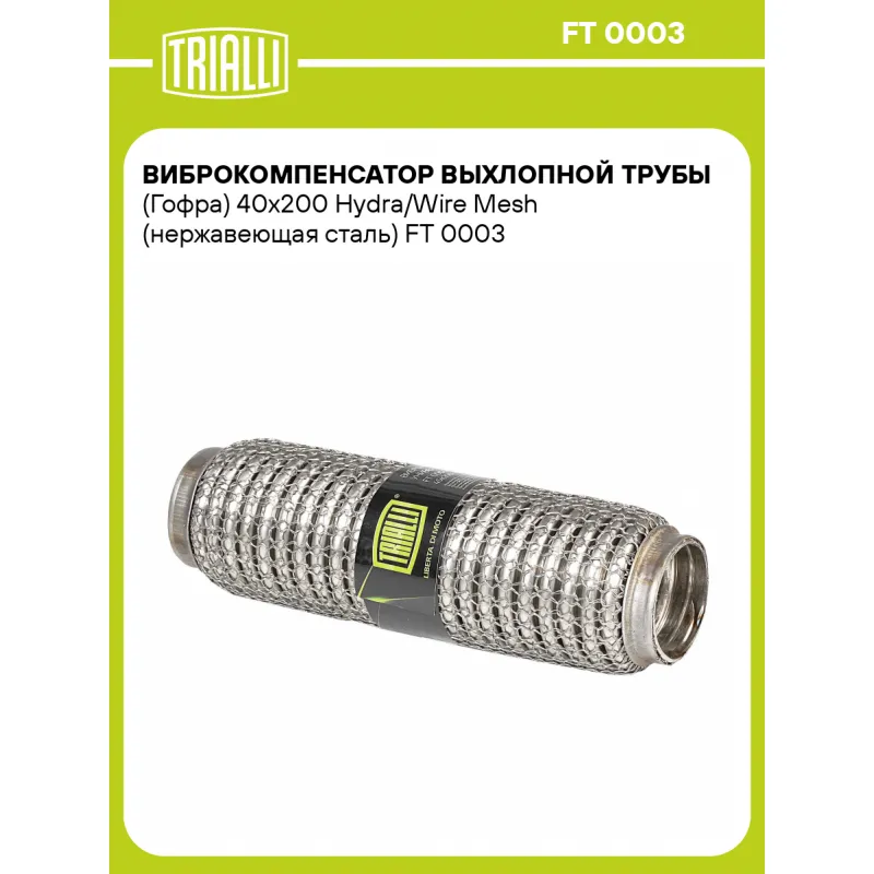 Виброкомпенсатор выхлопной трубы (Гофра) 40x200 Hydra/Wire Mesh (нержавеющая сталь) Характеристики: Артикул: FT 0003 OEM номера: 40x200, 40-200 Гарантийный срок: 2 года/60 тыс. Количество на автомобиль: 1 Тип конструкции: Wire Mesh / Hydra Особенности конструкции:: Трёхслойная Размер ID/NL, мм: 40/200 Под трубу диаметром, мм: 38-40 Длина изделия (мм): 200 Материал: Нержавеющая сталь марки AISI 201 Товарная линейка: BLACK Дополнительная информация: Этикетка изделия может отличаться от представленной на фото Комплектация: Виброкомпенсатор выхлопной трубы - 1 шт Гарантия: от 1 года.