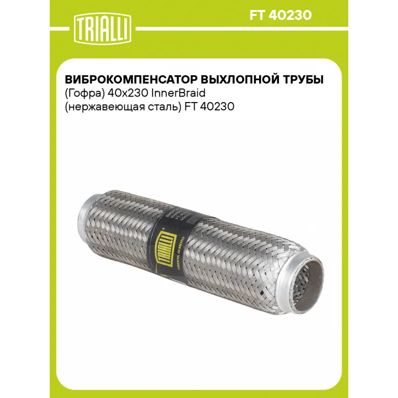 Виброкомпенсатор выхлопной трубы (Гофра) 40x230 InnerBraid (нержавеющая сталь) Характеристики: Артикул: FT 40230 OEM номера: 40-230, 40x230 Гарантийный срок: 2 года/60 тыс. Количество на автомобиль: 1 Тип конструкции: InnerBraid Особенности конструкции:: Трёхслойная Размер ID/NL, мм: 40/230 Под трубу диаметром, мм: 38-40 Длина изделия (мм): 230 Материал: Нержавеющая сталь марки AISI 201 Товарная линейка: BLACK Дополнительная информация: Этикетка изделия может отличаться от представленной на фото Комплектация: Виброкомпенсатор выхлопной трубы - 1 шт Гарантия: от 1 года.