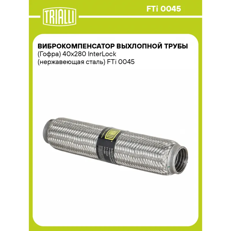 Виброкомпенсатор выхлопной трубы (Гофра) 40x280 InterLock (нержавеющая сталь) Характеристики: Артикул: FTi 0045 OEM номера: 40-280, 40x280 Гарантийный срок: 2 года/60 тыс. Количество на автомобиль: 1 Тип конструкции: InterLock Особенности конструкции:: Трёхслойная Размер ID/NL, мм: 40/280 Под трубу диаметром, мм: 38-40 Длина изделия (мм): 280 Материал: Нержавеющая сталь марки AISI 201 Товарная линейка: BLACK Дополнительная информация: Этикетка изделия может отличаться от представленной на фото Комплектация: Виброкомпенсатор выхлопной трубы - 1 шт Гарантия: от 1 года.