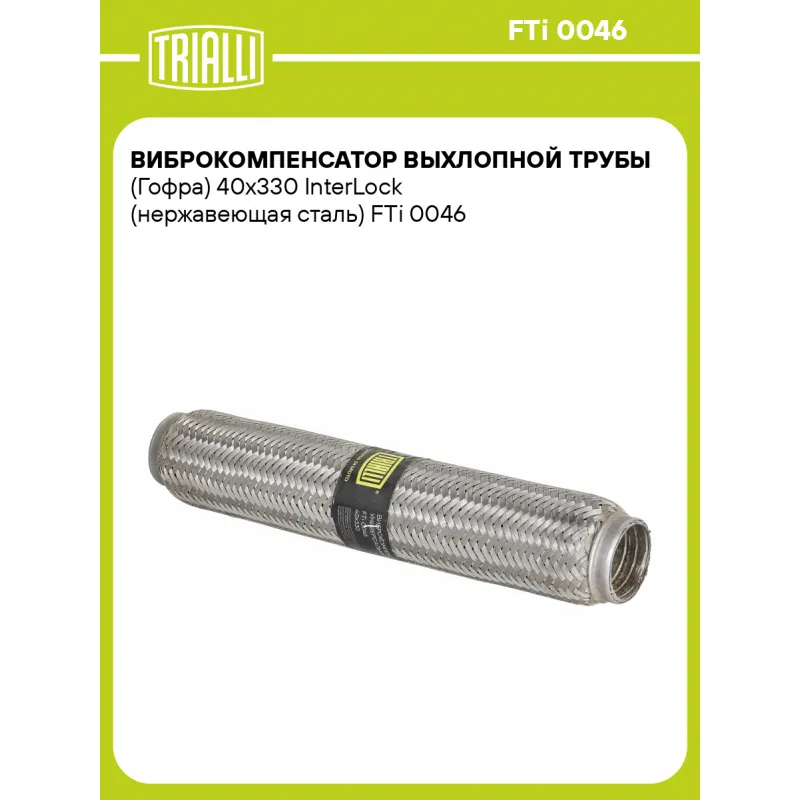 Виброкомпенсатор выхлопной трубы (Гофра) 40x330 InterLock (нержавеющая сталь) Характеристики: Артикул: FTi 0046 OEM номера: 40-330, 40x330 Гарантийный срок: 2 года/60 тыс. Количество на автомобиль: 1 Тип конструкции: InterLock Особенности конструкции:: Трёхслойная Размер ID/NL, мм: 40/330 Под трубу диаметром, мм: 38-40 Длина изделия (мм): 330 Материал: Нержавеющая сталь марки AISI 201 Товарная линейка: BLACK Дополнительная информация: Этикетка изделия может отличаться от представленной на фото Комплектация: Виброкомпенсатор выхлопной трубы - 1 шт Гарантия: от 1 года.
