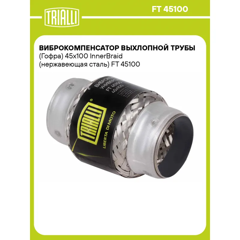 Виброкомпенсатор выхлопной трубы (Гофра) 45x100 InnerBraid (нержавеющая сталь) Характеристики: Артикул: FT 45100 OEM номера: 45x100 InnerBraid, 45x100, 45100, 45х100 Гарантийный срок: 2 года/60 тыс. Количество на автомобиль: 1 Тип конструкции: InnerBraid Особенности конструкции:: Трёхслойная Размер ID/NL, мм: 45/100 Под трубу диаметром, мм: 43-45 Длина изделия (мм): 100 Материал: Нержавеющая сталь марки AISI 201 Товарная линейка: BLACK Дополнительная информация: Этикетка изделия может отличаться от представленной на фото Комплектация: Виброкомпенсатор выхлопной трубы - 1 шт Гарантия: от 1 года.