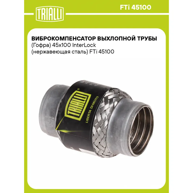 Виброкомпенсатор выхлопной трубы (Гофра) 45x100 InterLock (нержавеющая сталь) Характеристики: Артикул: FTi 45100 OEM номера: 45x100 Interlock, 45x100, 45100, 45х100 Гарантийный срок: 2 года/60 тыс. Количество на автомобиль: 1 Тип конструкции: Interlock Особенности конструкции:: Трёхслойная Размер ID/NL, мм: 45/100 Под трубу диаметром, мм: 43-45 Длина изделия (мм): 100 Материал: Нержавеющая сталь марки AISI 201 Товарная линейка: BLACK Дополнительная информация: Этикетка изделия может отличаться от представленной на фото Комплектация: Виброкомпенсатор выхлопной трубы - 1 шт Гарантия: от 1 года.