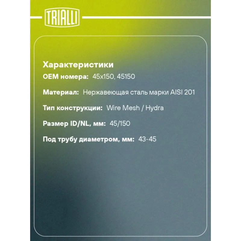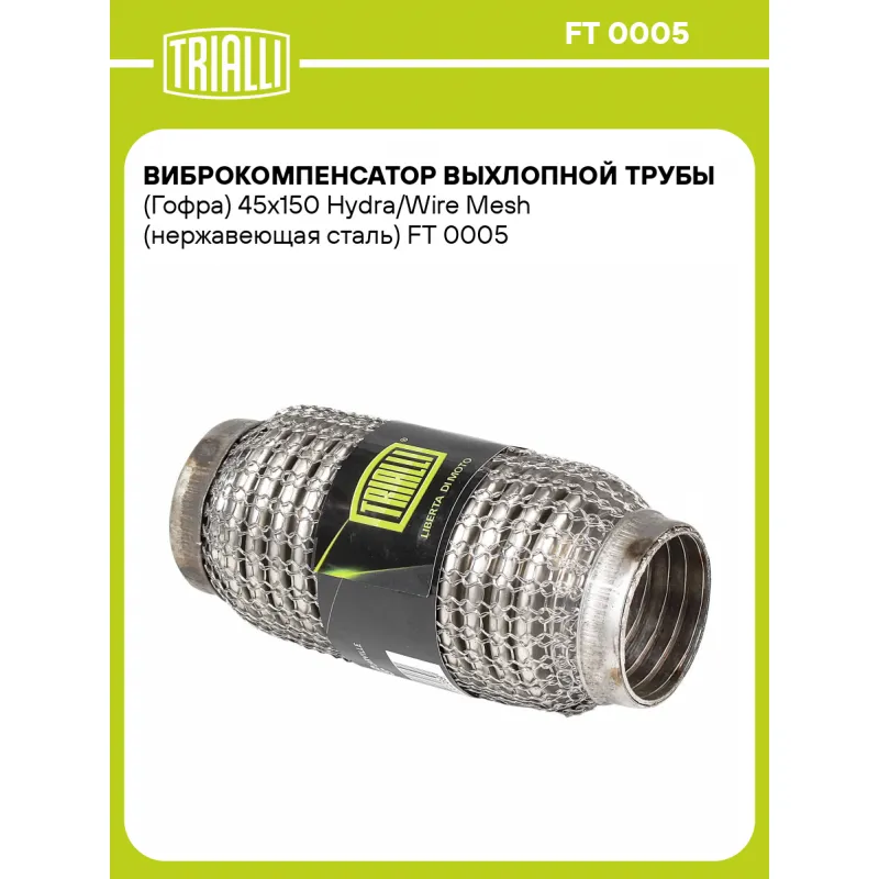 Виброкомпенсатор выхлопной трубы (Гофра) 45x150 Hydra/Wire Mesh (нержавеющая сталь) Характеристики: Артикул: FT 0005 OEM номера: 45x150, 45150 Гарантийный срок: 2 года/60 тыс. Количество на автомобиль: 1 Тип конструкции: Wire Mesh / Hydra Особенности конструкции:: Трёхслойная Размер ID/NL, мм: 45/150 Под трубу диаметром, мм: 43-45 Длина изделия (мм): 150 Материал: Нержавеющая сталь марки AISI 201 Товарная линейка: BLACK Дополнительная информация: Этикетка изделия может отличаться от представленной на фото Комплектация: Виброкомпенсатор выхлопной трубы - 1 шт Гарантия: от 1 года.