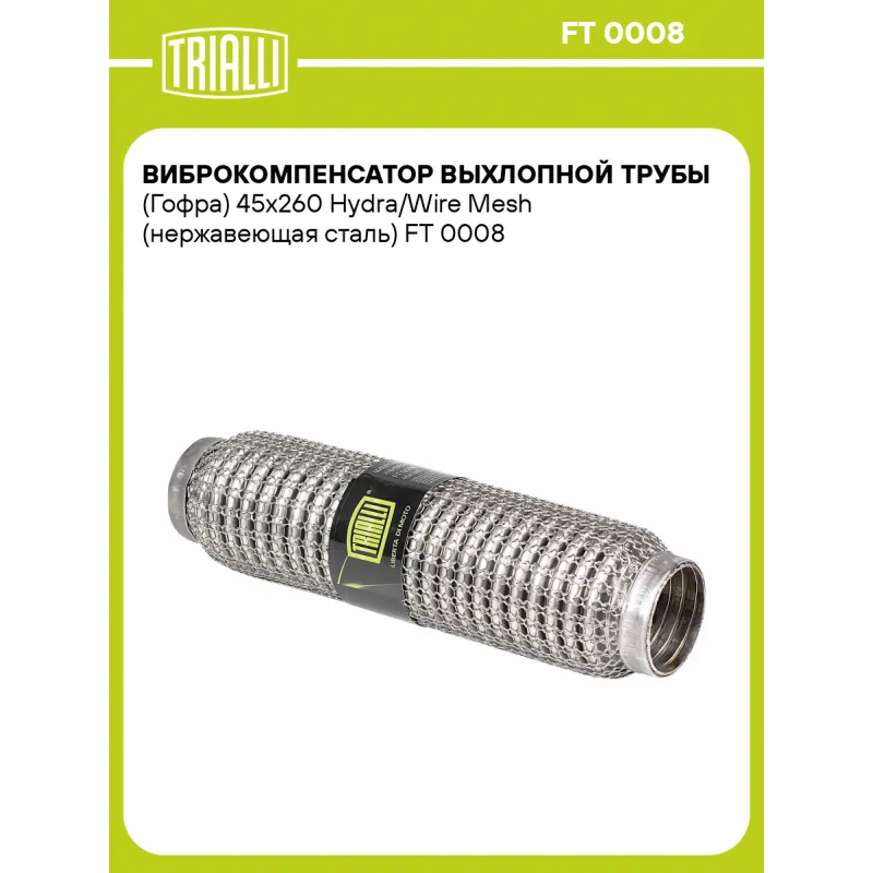Виброкомпенсатор выхлопной трубы (Гофра) 45x260 Hydra/Wire Mesh (нержавеющая сталь) Характеристики: Артикул: FT 0008 OEM номера: 45x260, 45260 Гарантийный срок: 2 года/60 тыс. Количество на автомобиль: 1 Тип конструкции: Wire Mesh / Hydra Особенности конструкции:: Трёхслойная Размер ID/NL, мм: 45/260 Под трубу диаметром, мм: 43-45 Длина изделия (мм): 260 Материал: Нержавеющая сталь марки AISI 201 Товарная линейка: BLACK Дополнительная информация: Этикетка изделия может отличаться от представленной на фото Комплектация: Виброкомпенсатор выхлопной трубы - 1 шт Гарантия: от 1 года.