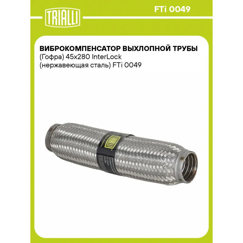 Виброкомпенсатор выхлопной трубы (Гофра) 45x280 InterLock (нержавеющая сталь) Характеристики: Артикул: FTi 0049 OEM номера: 45-280, 45x280 Гарантийный срок: 2 года/60 тыс. Количество на автомобиль: 1 Тип конструкции: InterLock Особенности конструкции:: Трёхслойная Размер ID/NL, мм: 45/280 Под трубу диаметром, мм: 43-45 Длина изделия (мм): 280 Материал: Нержавеющая сталь марки AISI 201 Товарная линейка: BLACK Дополнительная информация: Этикетка изделия может отличаться от представленной на фото Комплектация: Виброкомпенсатор выхлопной трубы - 1 шт Гарантия: от 1 года.