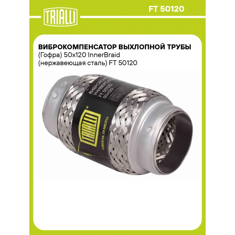 Виброкомпенсатор выхлопной трубы (Гофра) 50x120 InnerBraid (нержавеющая сталь) Характеристики: Артикул: FT 50120 OEM номера: 50x120 InnerBraid, 50x120, 50120, 50х120 Гарантийный срок: 2 года/60 тыс. Количество на автомобиль: 1 Тип конструкции: InnerBraid Особенности конструкции:: Трёхслойная Размер ID/NL, мм: 50/120 Под трубу диаметром, мм: 50-51 Длина изделия (мм): 120 Материал: Нержавеющая сталь марки AISI 201 Товарная линейка: BLACK Дополнительная информация: Этикетка изделия может отличаться от представленной на фото Комплектация: Виброкомпенсатор выхлопной трубы - 1 шт Гарантия: от 1 года.