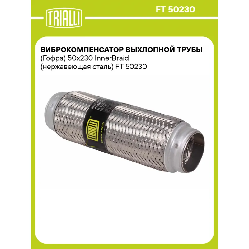 Виброкомпенсатор выхлопной трубы (Гофра) 50x230 InnerBraid (нержавеющая сталь) Характеристики: Артикул: FT 50230 OEM номера: 50x230 InnerBraid, 50x230, 50230, 50х230 Гарантийный срок: 2 года/60 тыс. Количество на автомобиль: 1 Тип конструкции: InnerBraid Особенности конструкции:: Трёхслойная Размер ID/NL, мм: 50/230 Под трубу диаметром, мм: 50-51 Длина изделия (мм): 230 Материал: Нержавеющая сталь марки AISI 201 Товарная линейка: BLACK Дополнительная информация: Этикетка изделия может отличаться от представленной на фото Комплектация: Виброкомпенсатор выхлопной трубы - 1 шт Гарантия: от 1 года.