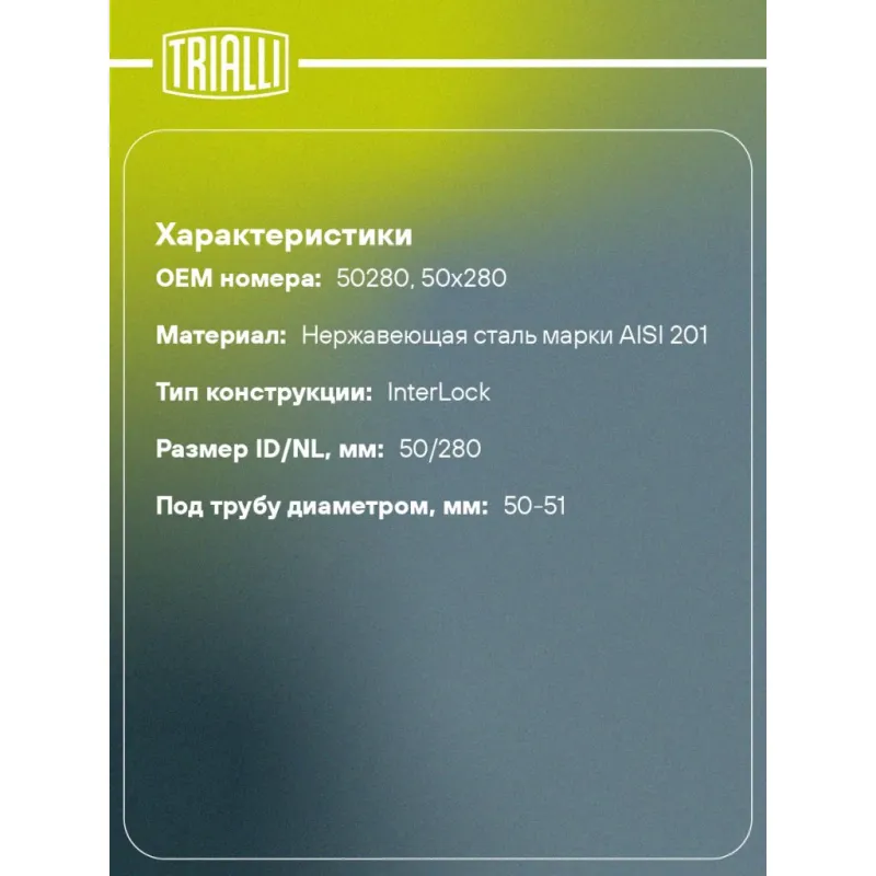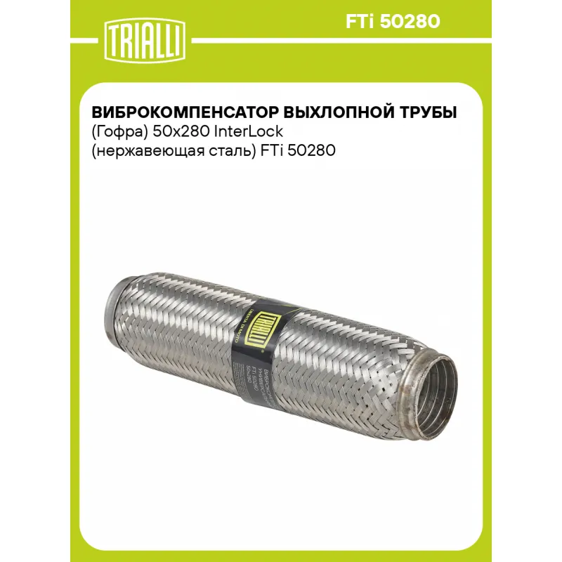Виброкомпенсатор выхлопной трубы (Гофра) 50x280 InterLock (нержавеющая сталь) Характеристики: Артикул: FTi 50280 OEM номера: 50280, 50x280 Гарантийный срок: 2 года/60 тыс. Количество на автомобиль: 1 Тип конструкции: InterLock Особенности конструкции:: Трёхслойная Размер ID/NL, мм: 50/280 Под трубу диаметром, мм: 50-51 Длина изделия (мм): 280 Материал: Нержавеющая сталь марки AISI 201 Товарная линейка: BLACK Дополнительная информация: Этикетка изделия может отличаться от представленной на фото Комплектация: Виброкомпенсатор выхлопной трубы - 1 шт Гарантия: от 1 года.