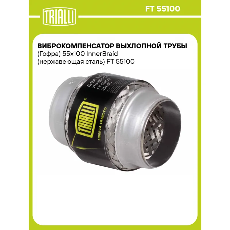 Виброкомпенсатор выхлопной трубы (Гофра) 55x100 InnerBraid (нержавеющая сталь) Характеристики: Артикул: FT 55100 OEM номера: 55x100 InnerBraid, 55x100, 55100, 55х100 Гарантийный срок: 2 года/60 тыс. Количество на автомобиль: 1 Тип конструкции: InnerBraid Особенности конструкции:: Трёхслойная Размер ID/NL, мм: 55/100 Под трубу диаметром, мм: 54-55 Длина изделия (мм): 100 Материал: Нержавеющая сталь марки AISI 201 Товарная линейка: BLACK Дополнительная информация: Этикетка изделия может отличаться от представленной на фото Комплектация: Виброкомпенсатор выхлопной трубы - 1 шт Гарантия: от 1 года.