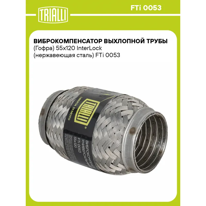 Виброкомпенсатор выхлопной трубы (Гофра) 55x120 InterLock (нержавеющая сталь) Характеристики: Артикул: FTi 0053 OEM номера: 55-120, 55x120 Гарантийный срок: 2 года/60 тыс. Количество на автомобиль: 1 Тип конструкции: InterLock Особенности конструкции:: Трёхслойная Размер ID/NL, мм: 55/120 Под трубу диаметром, мм: 54-55 Длина изделия (мм): 120 Материал: Нержавеющая сталь марки AISI 201 Товарная линейка: BLACK Дополнительная информация: Этикетка изделия может отличаться от представленной на фото Комплектация: Виброкомпенсатор выхлопной трубы - 1 шт Гарантия: от 1 года.